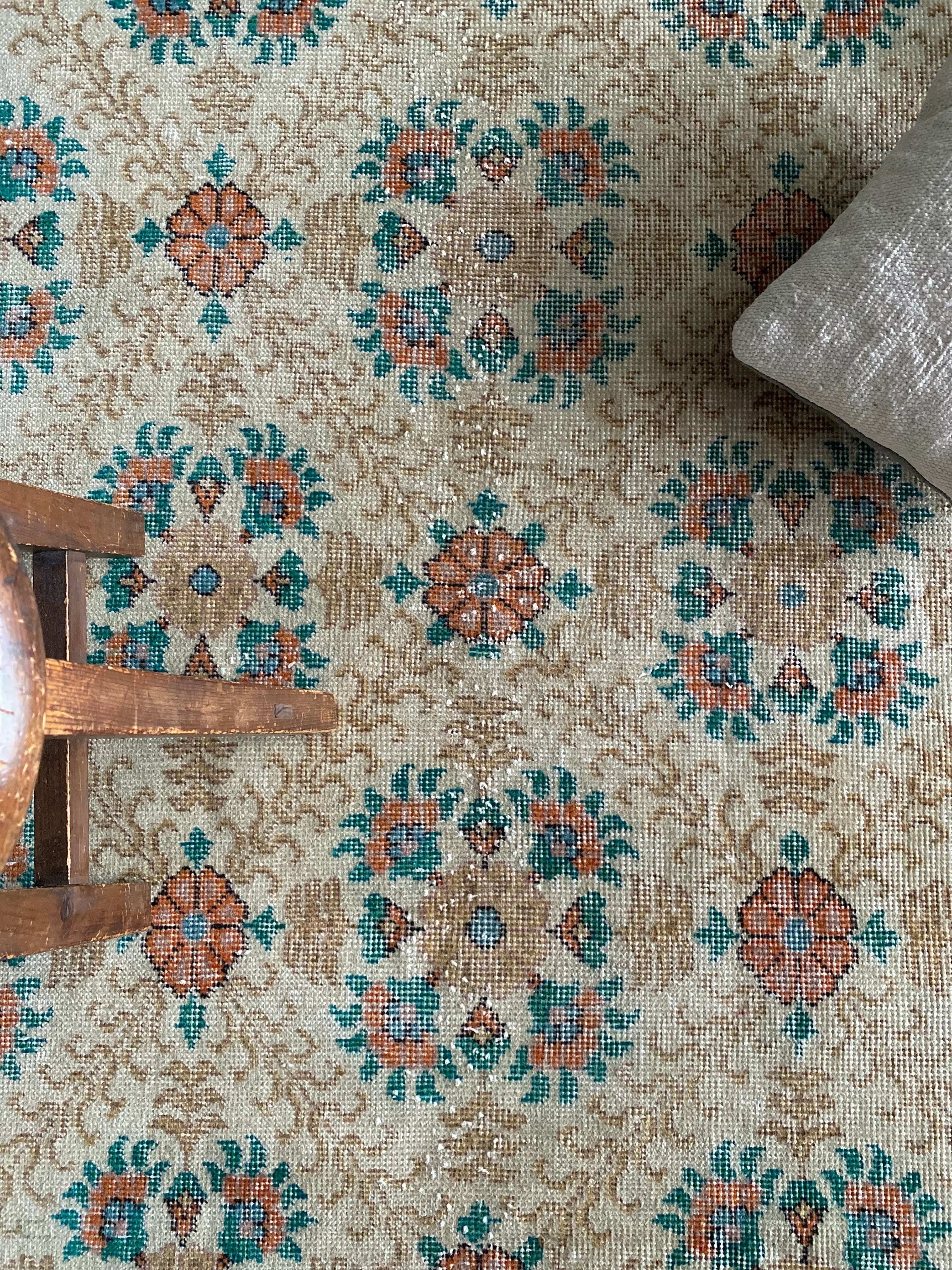 黄味かがったキナリベージュにオレンジと緑のお花柄。モロッコタイルの様な素敵な1枚です。