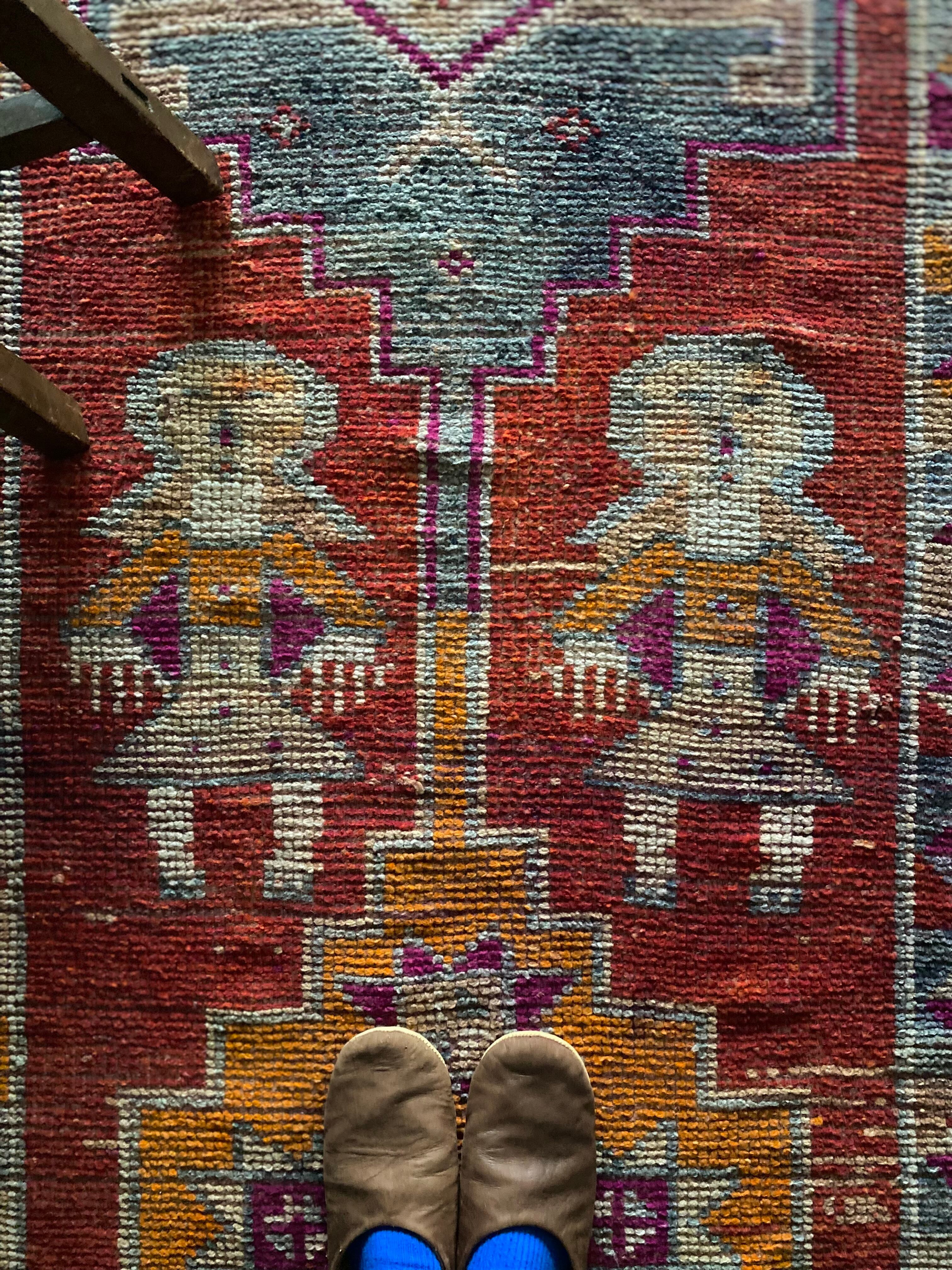 ✔︎ラグにもよりますが羊毛の匂いや50年前のヴィンテージ品ですのでオールド特有の匂いが感じられる事があります。裏返して短時間の天日干しを繰り返しますと徐々に匂いは軽減されていきます。