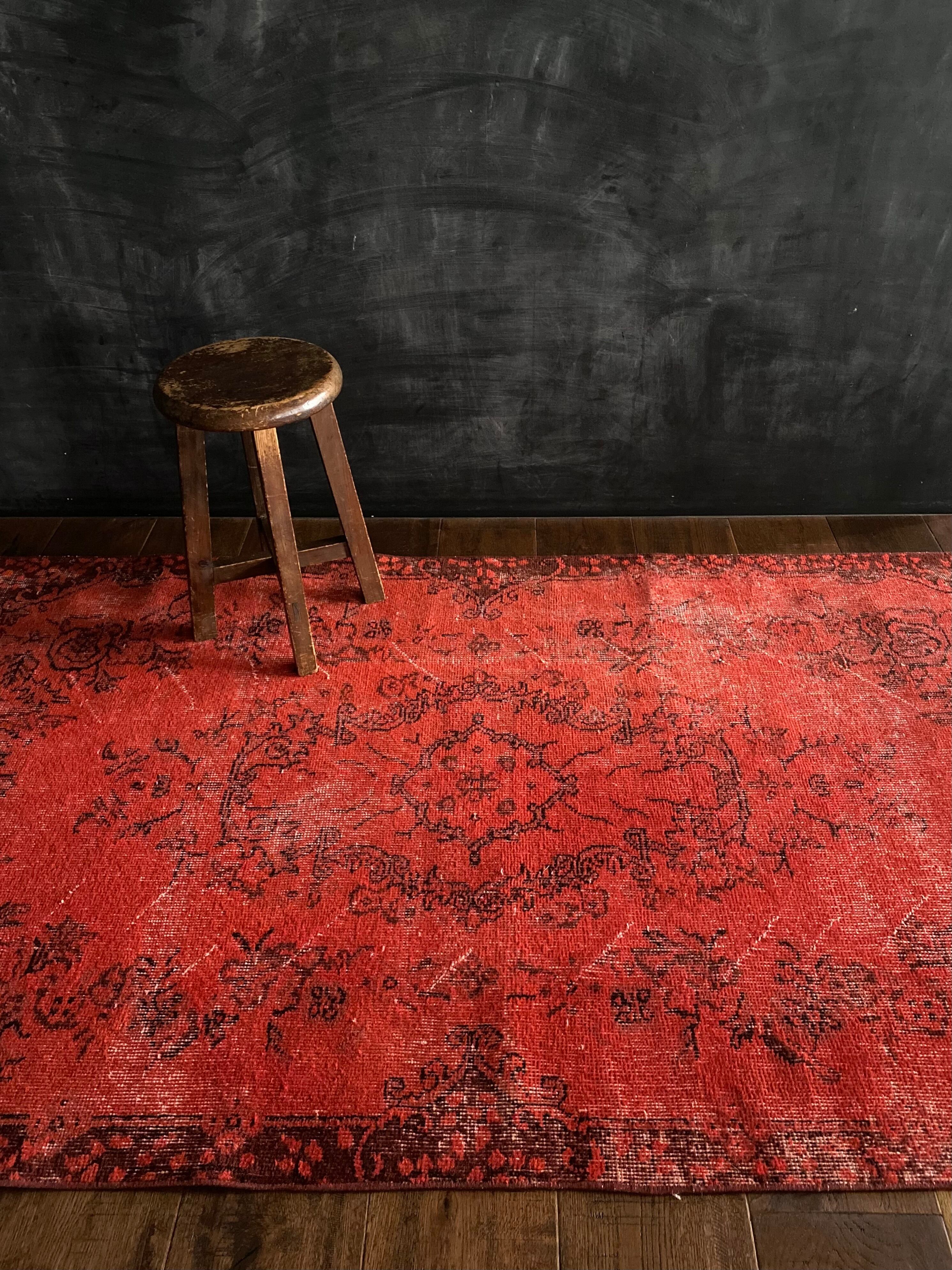カラー: 朱色味のあるレッドを基調とし、クラシックなメダリオン柄が黒で繊細に織り込まれ、ダークブラウンで縁取られたヴィンテージ・トルコラグ。空間に独特の雰囲気と温かみを与えます。