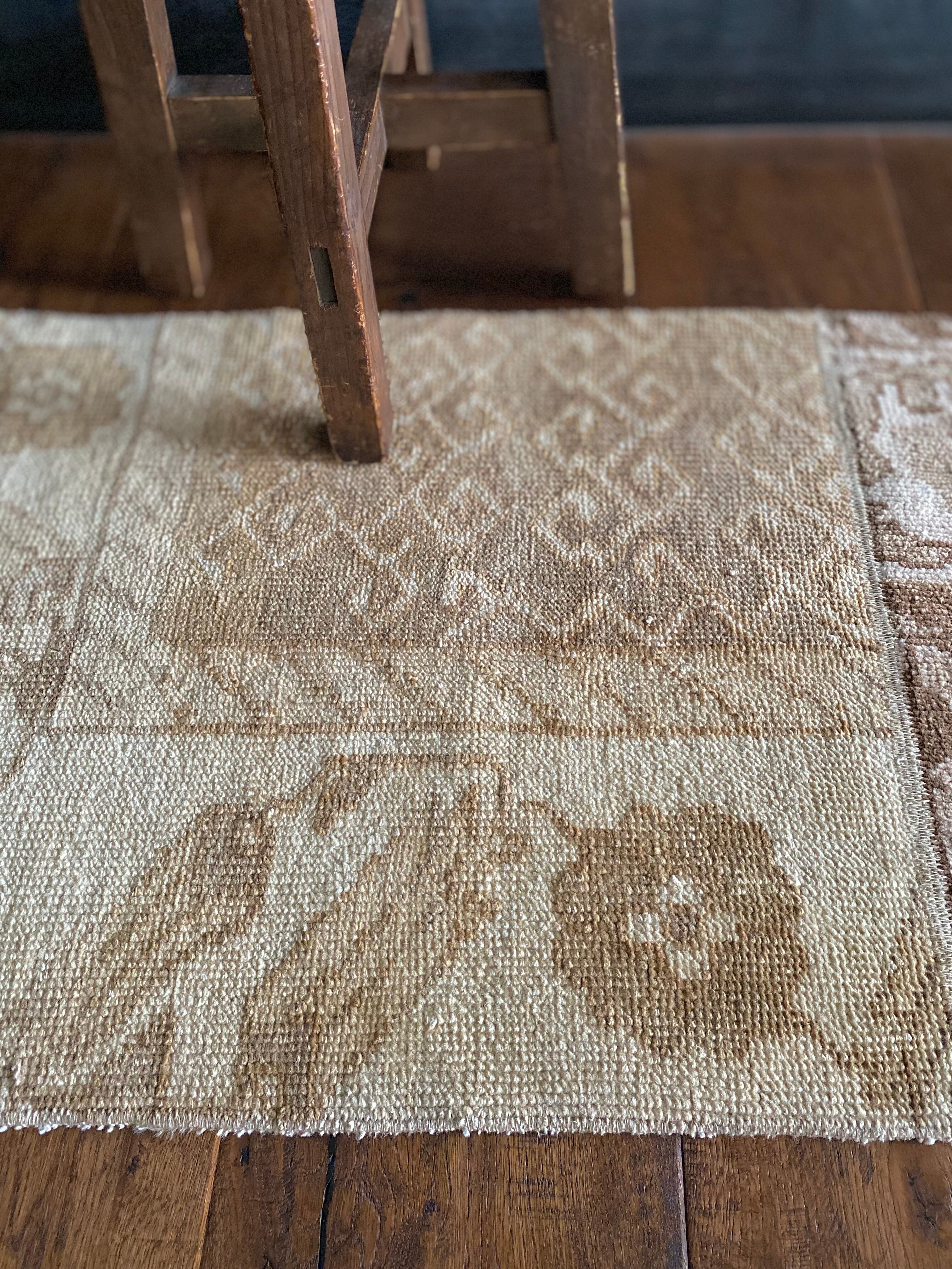 落ち着いたベージュ〜ブラウン系のパターンが組み合わされ、経年による柔らかな風合いが魅力です。アンティークならではの表情を持ち、敷くだけで空間に味わいをプラスしてくれます。