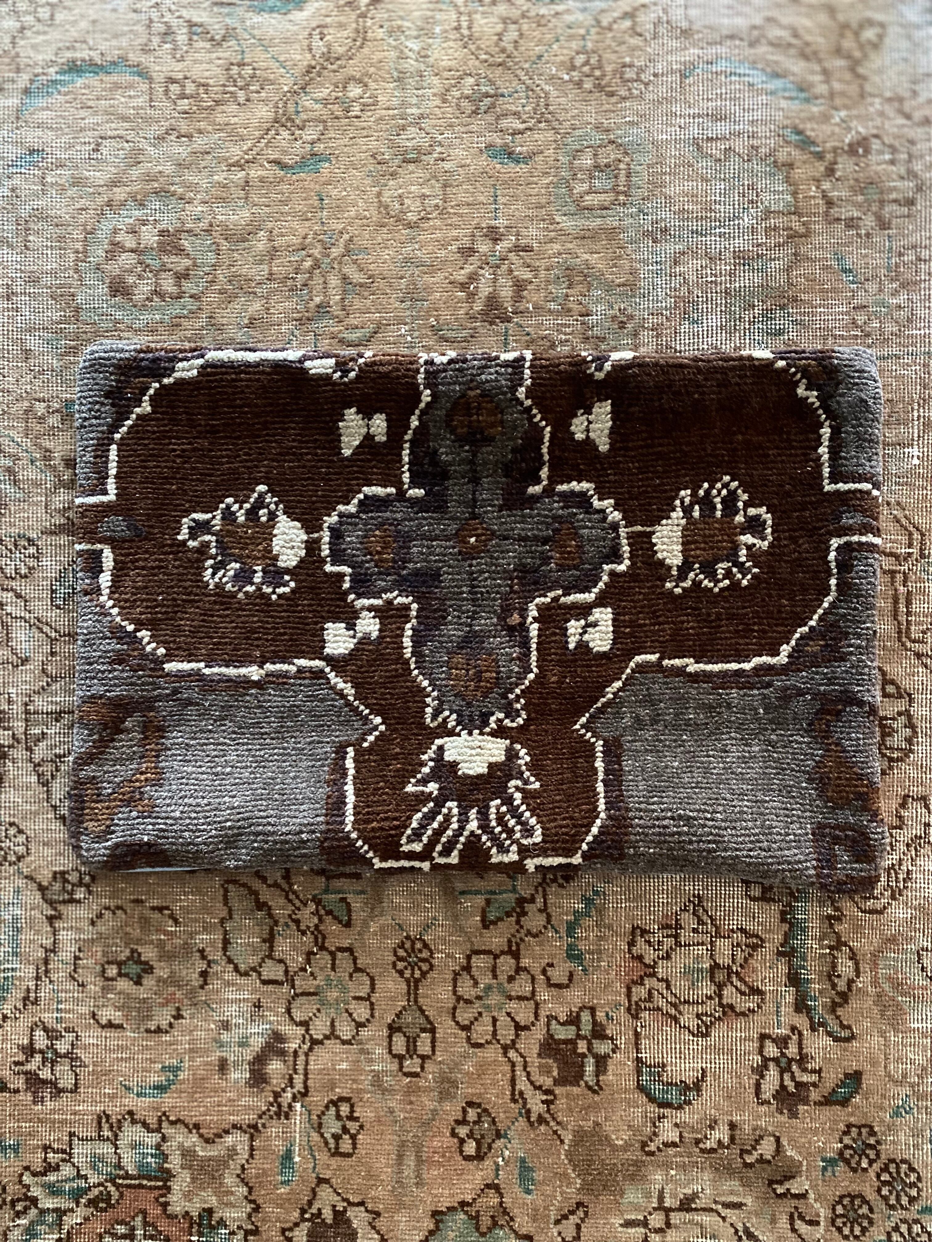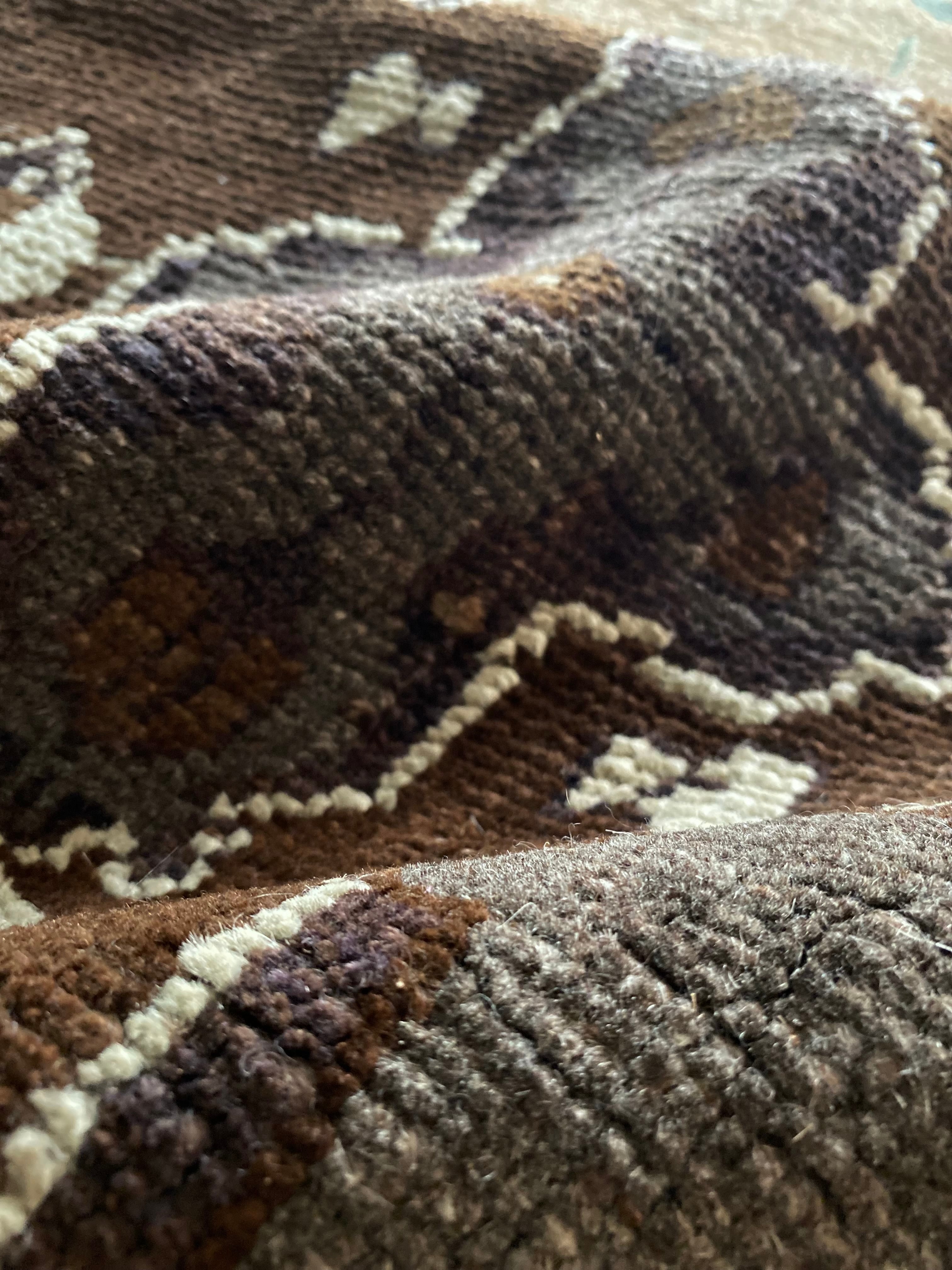 本品は1970年代のヴィンテージラグを使用しています。経年による羊毛特有の匂いや、**ヴィンテージ特有の風合い(撓み・擦れ・補修跡など)**が見られる場合がございます。これらは商品の特性・魅力としてご理解いただけますと幸いです。