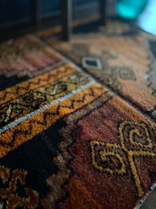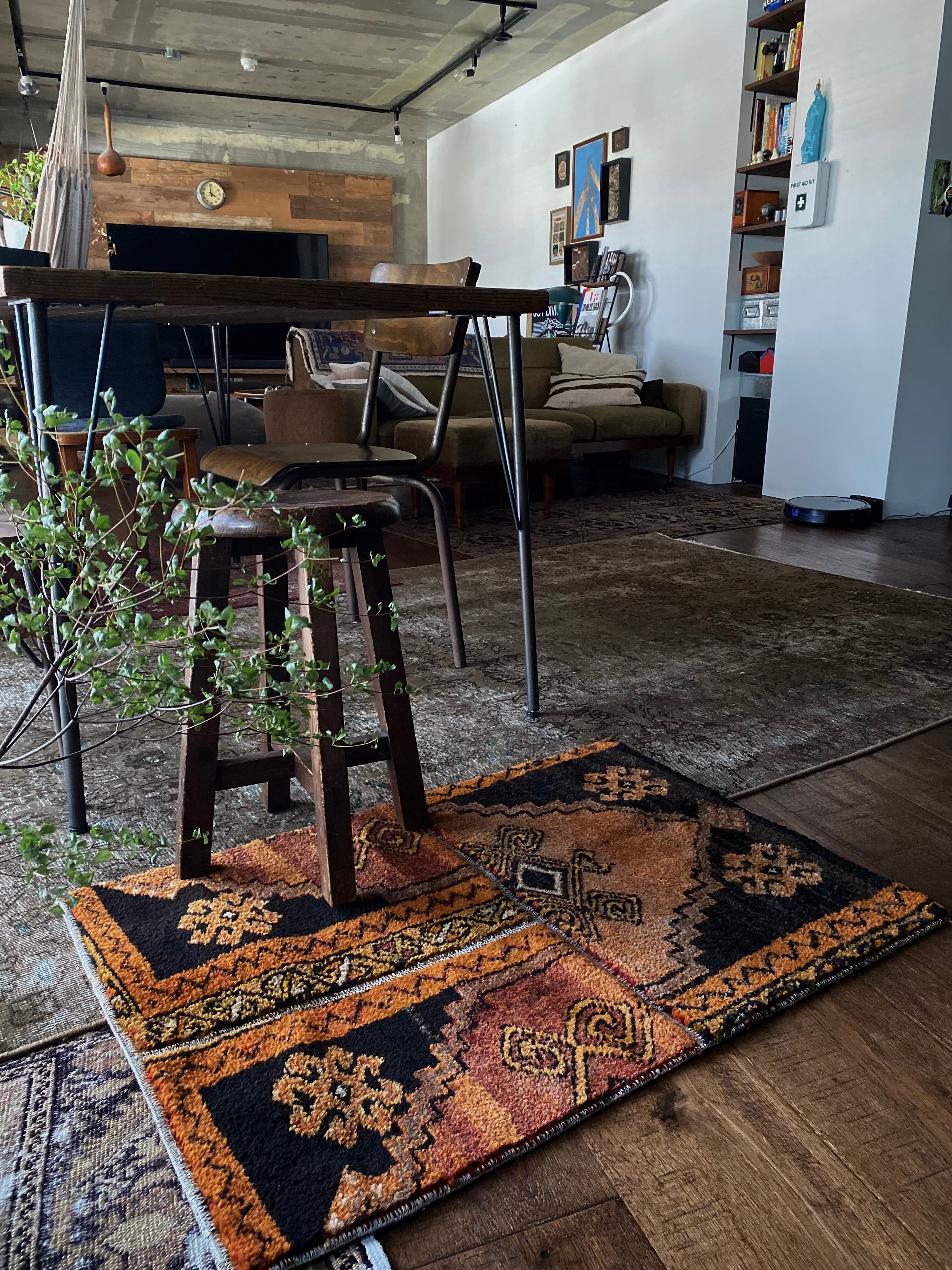 ハンドメイドの温かみとヴィンテージならではの色味の深みがあり、小ぶりながらも存在感のある一枚。玄関やベッドサイド、チェアの足元などに置くだけで空間を引き締めてくれます。