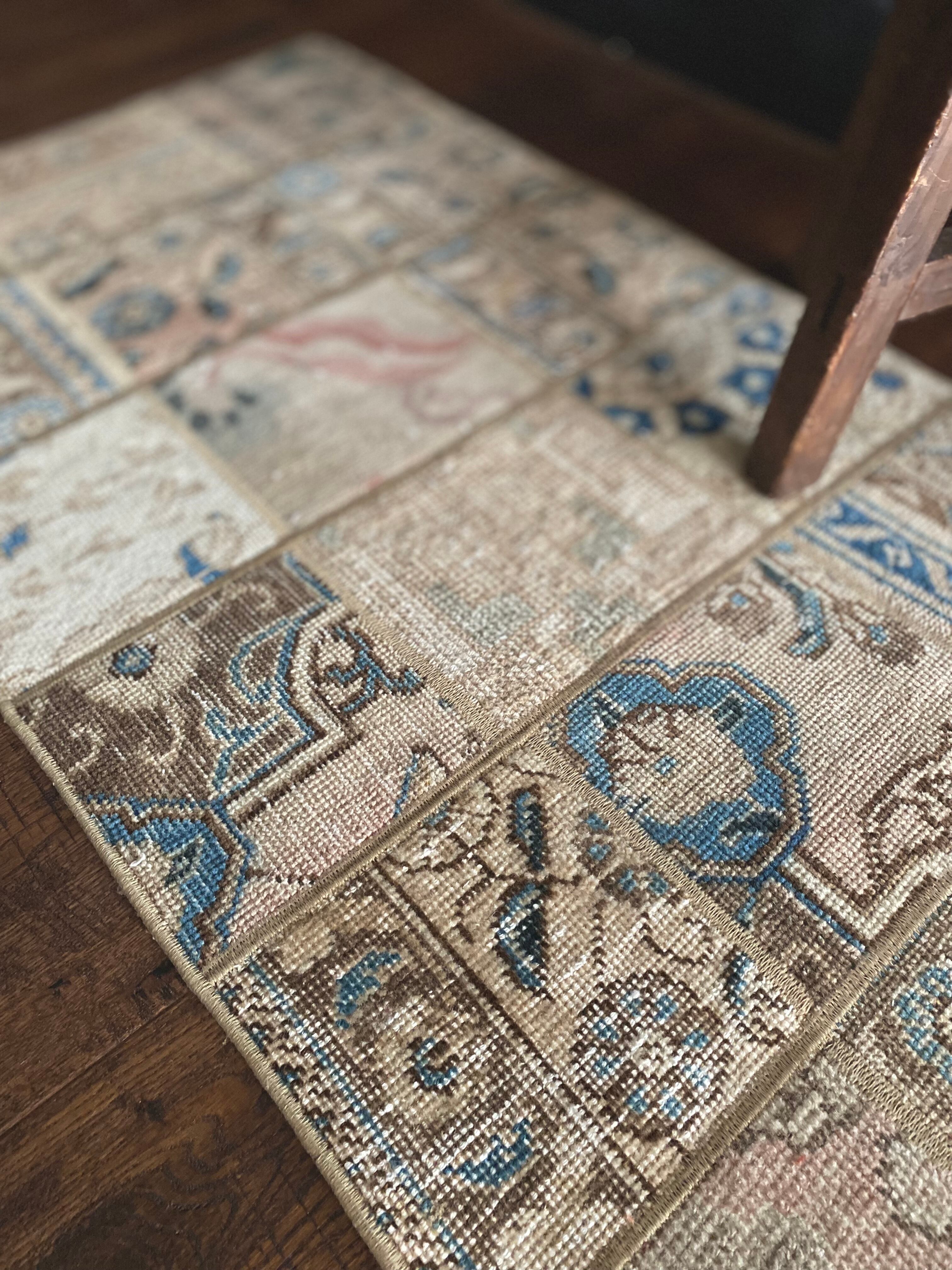 カラー:トルコヴィンテージラグをリメイクし、モダンなパッチワークデザインに仕立てた一点物のラグです。
