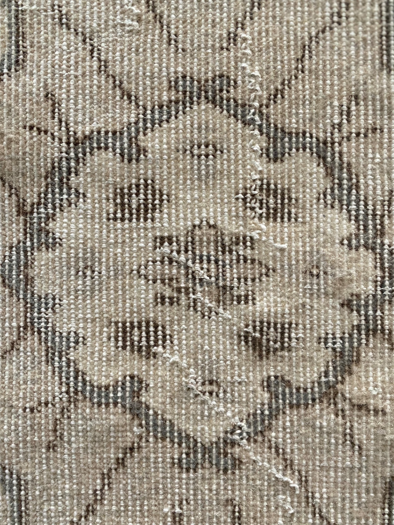 カラー:柔らかいベージュとブラウンの色合いと淡いくすみ水色が少し折り混じってるクラシックな模様が魅力のヴィンテージラグです。