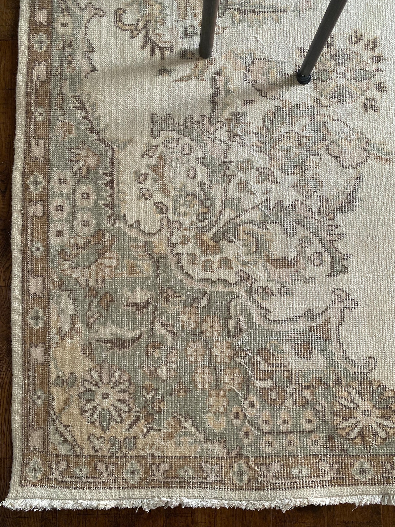 カラー:柔らかいベージュをベースにとブラウンとセージグリーン,淡いピンクやマスタードが少し折り混じってるクラシックな模様が魅力のヴィンテージラグです。
