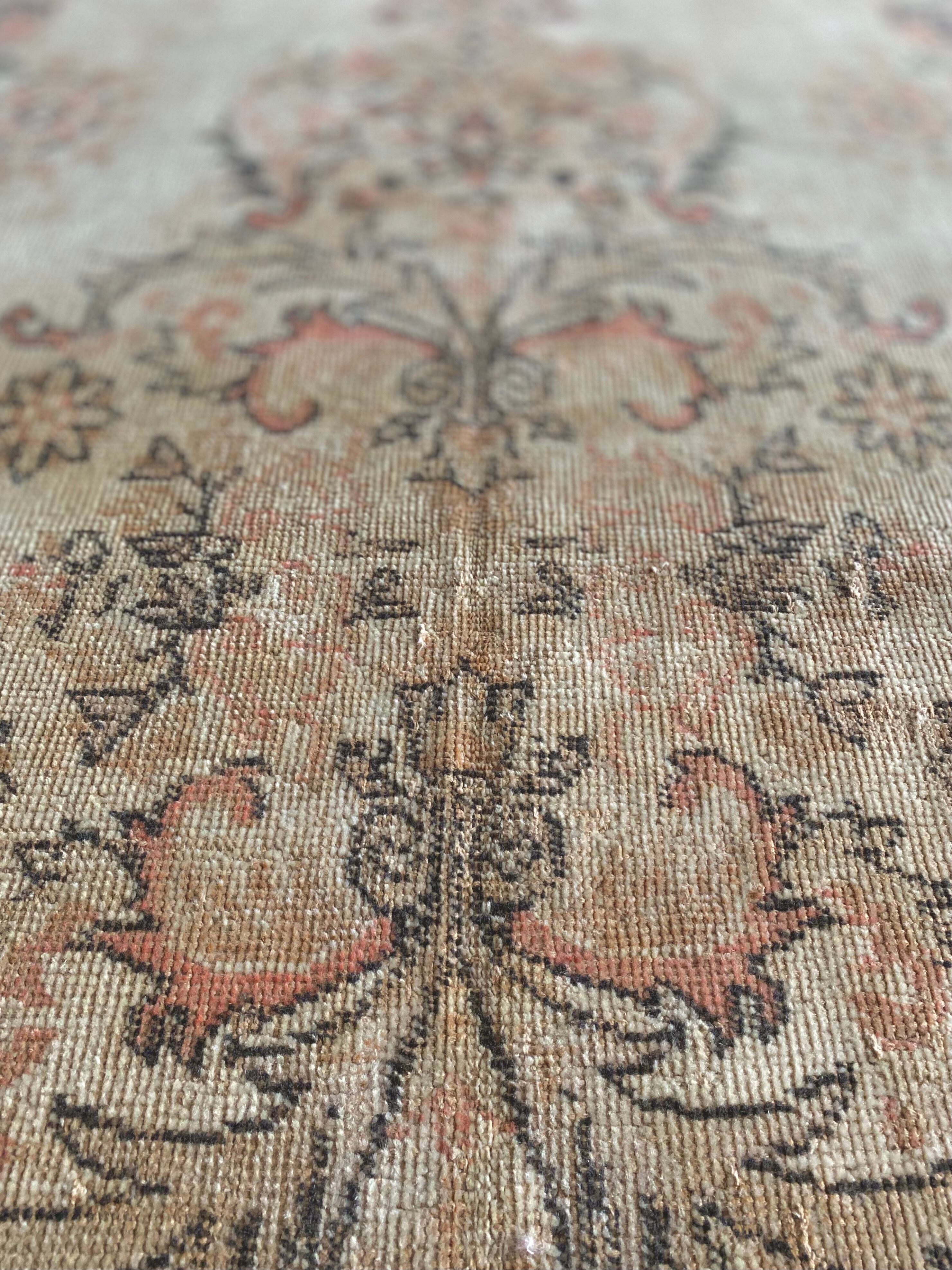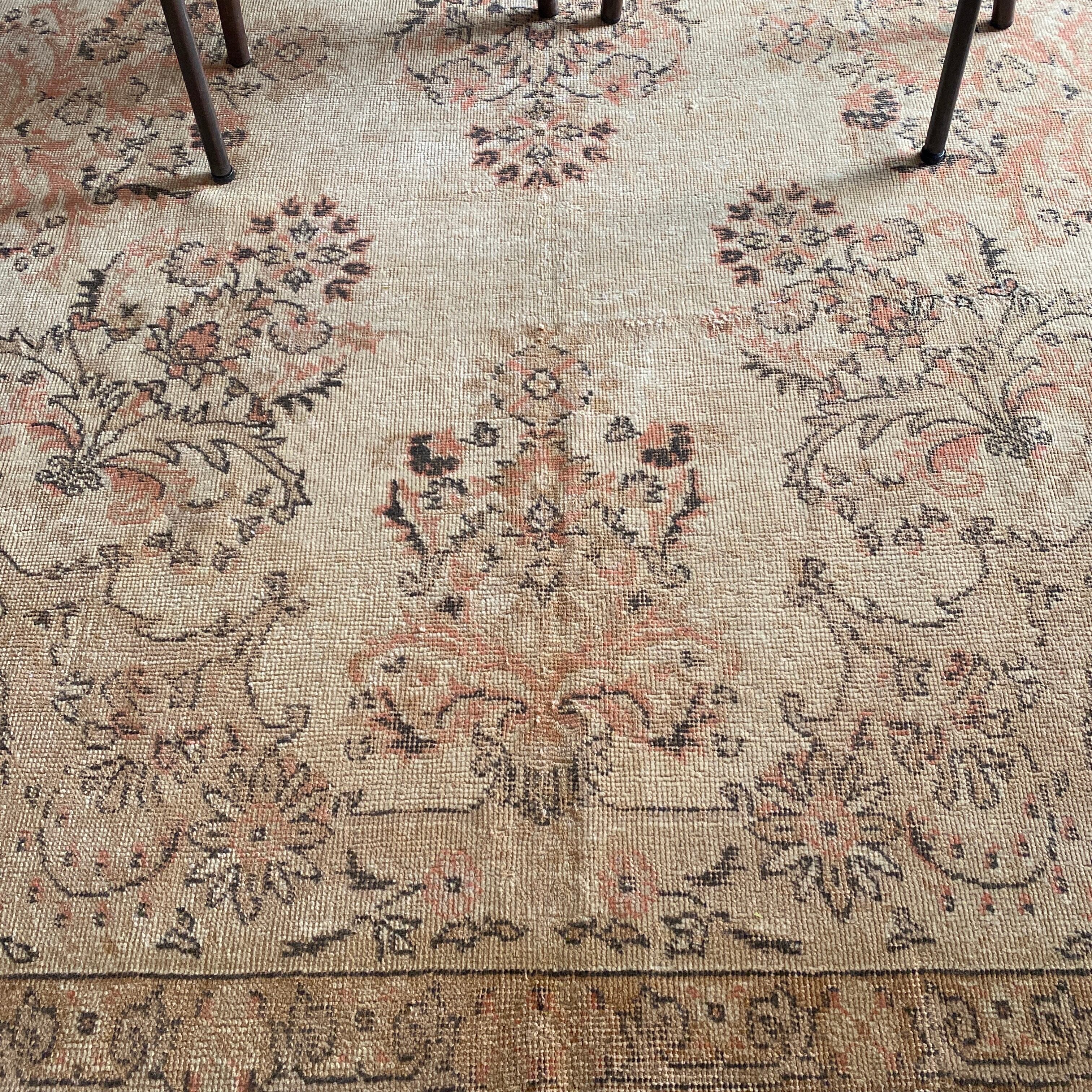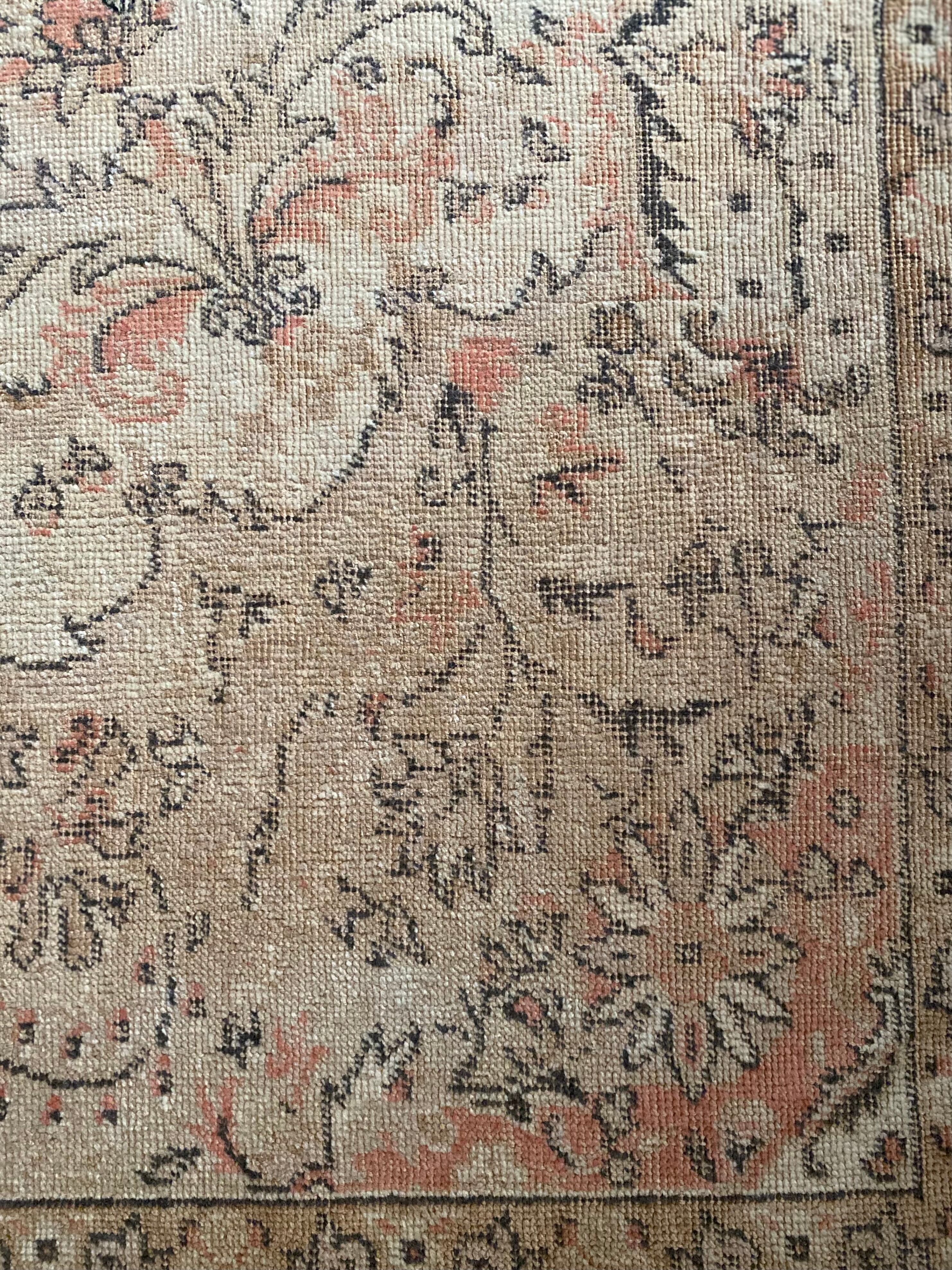 カラー:サンドベージュをベースに、アプリコットとブラックのクラシカルなボタニカル柄が美しく映えるヴィンテージラグ。