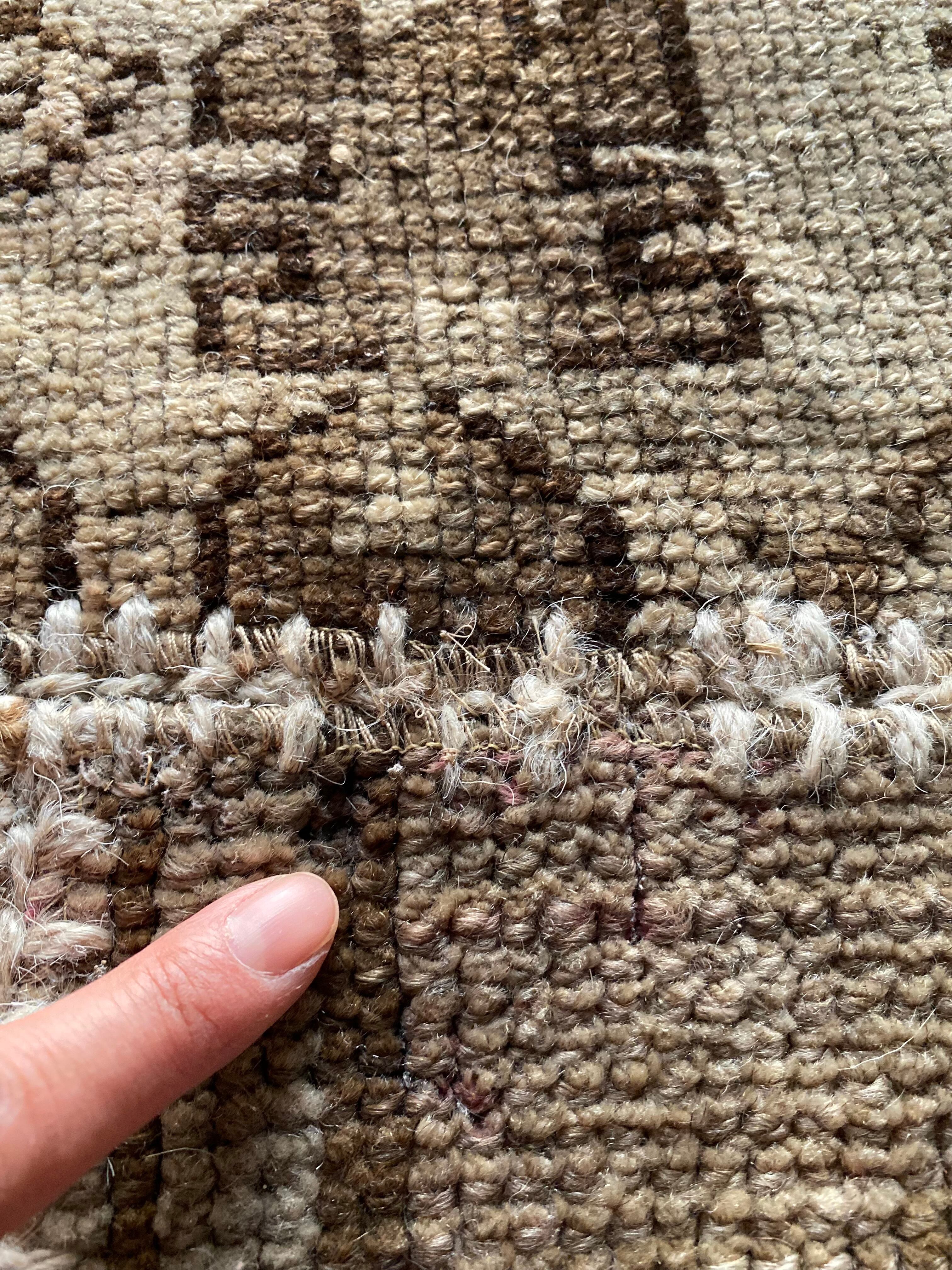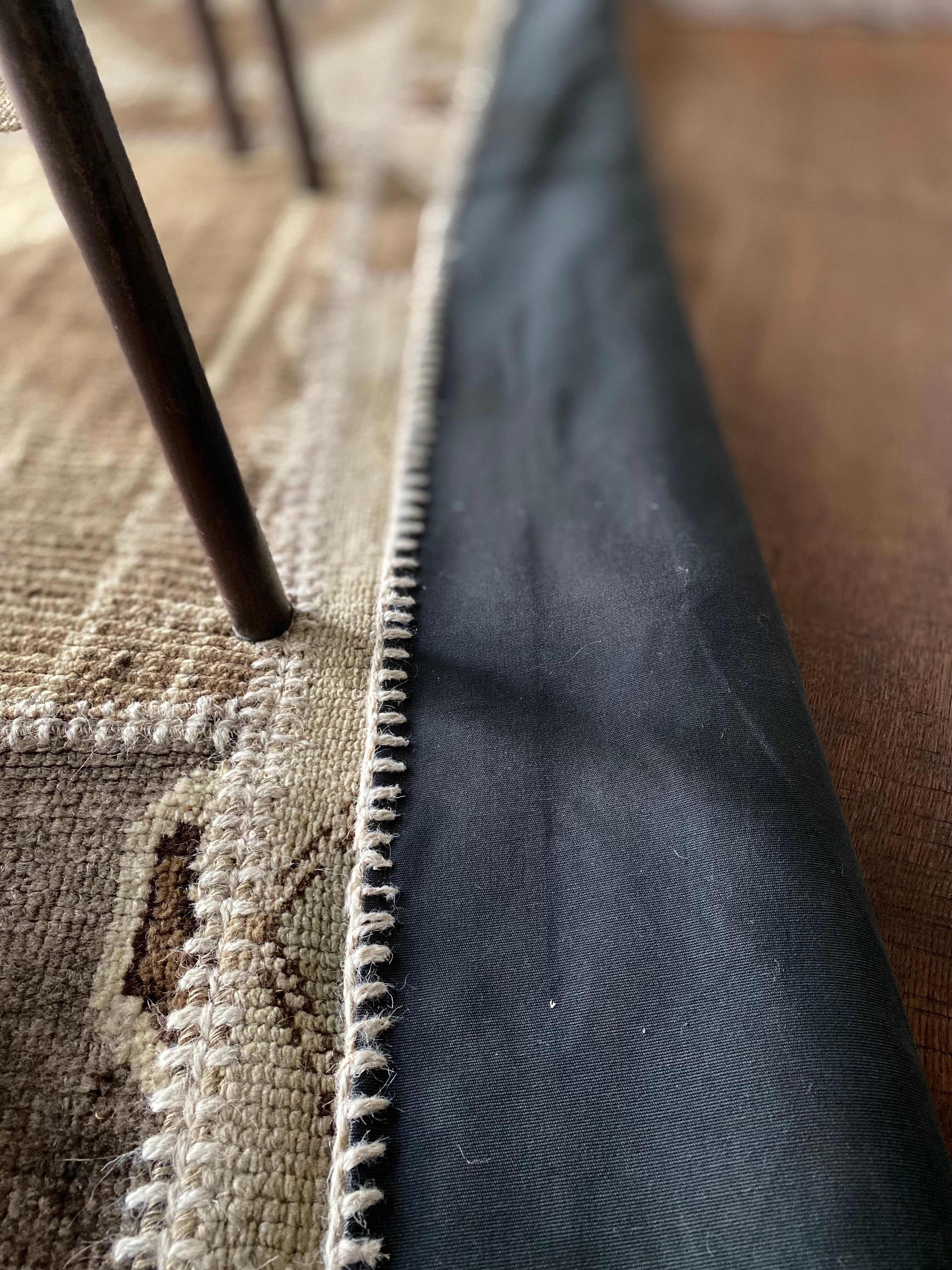 なお、ラグ本体のピース同士はしっかりとかがって縫製されておりますので、構造的にほつれる心配はございません。もし装飾部分の糸が少しほつれた場合でも、ベージュ系の糸で簡単に補修していただければ大丈夫かと思います。