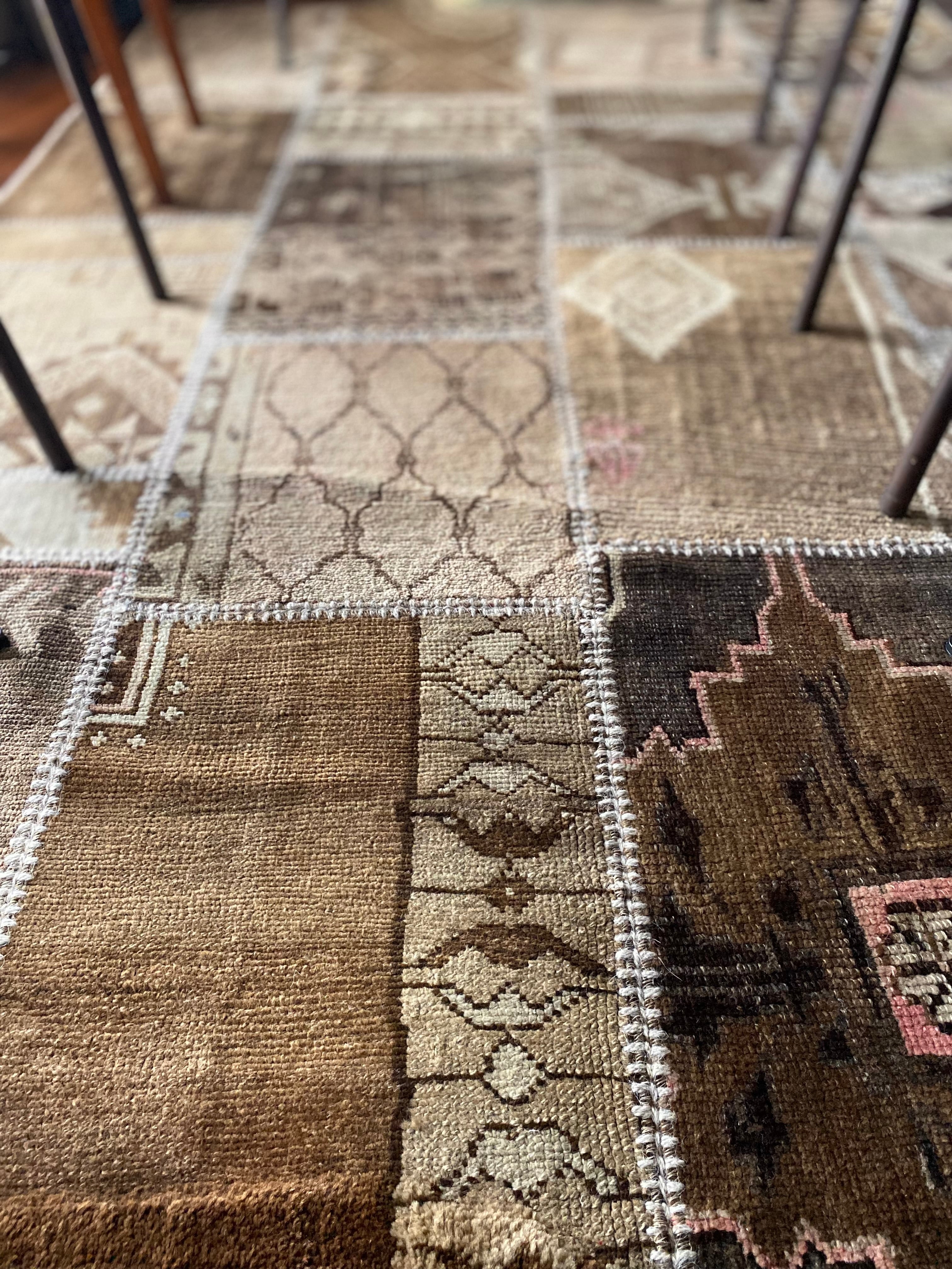 こちらのラグは、パッチワーク部分をつなぐホワイトベージュの装飾糸に一部弱い箇所があり、トルコから到着した際にほつれが見られたため、特別価格にてご案内しております。