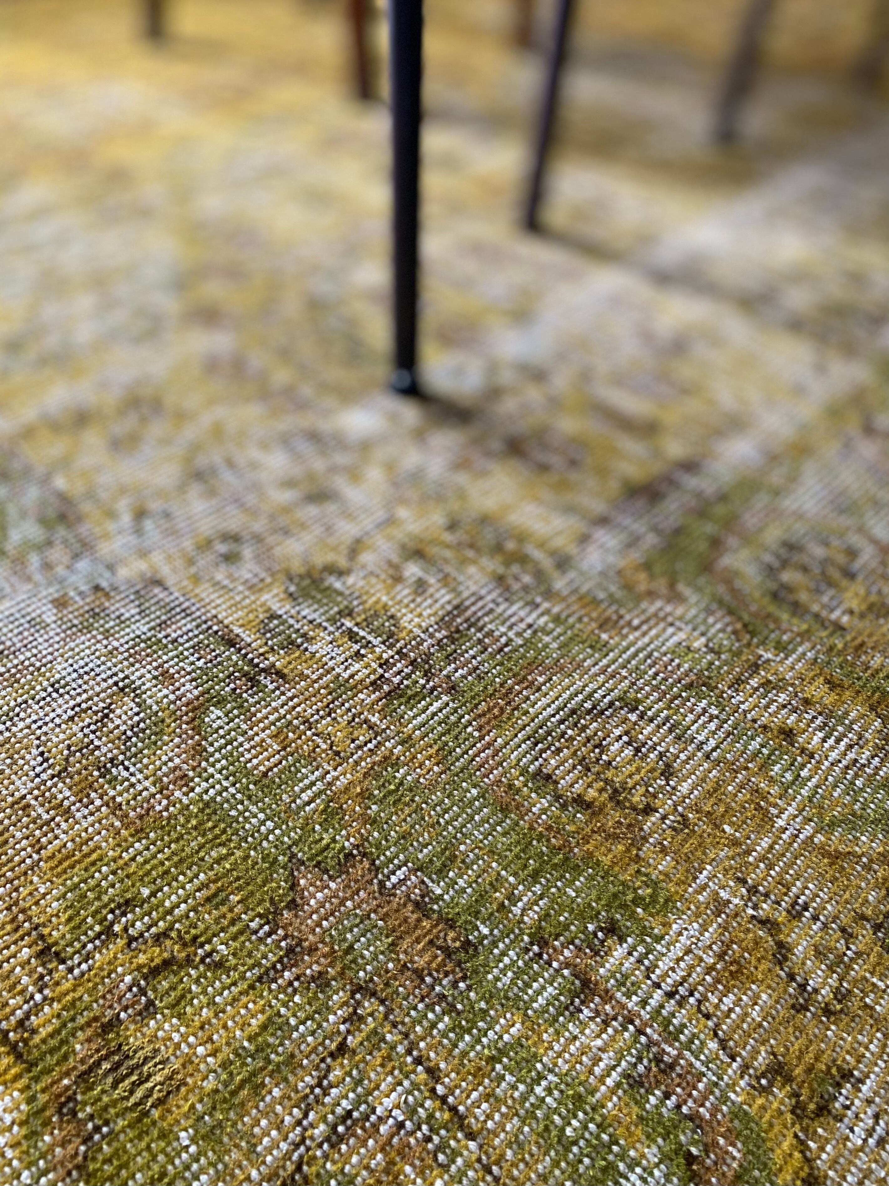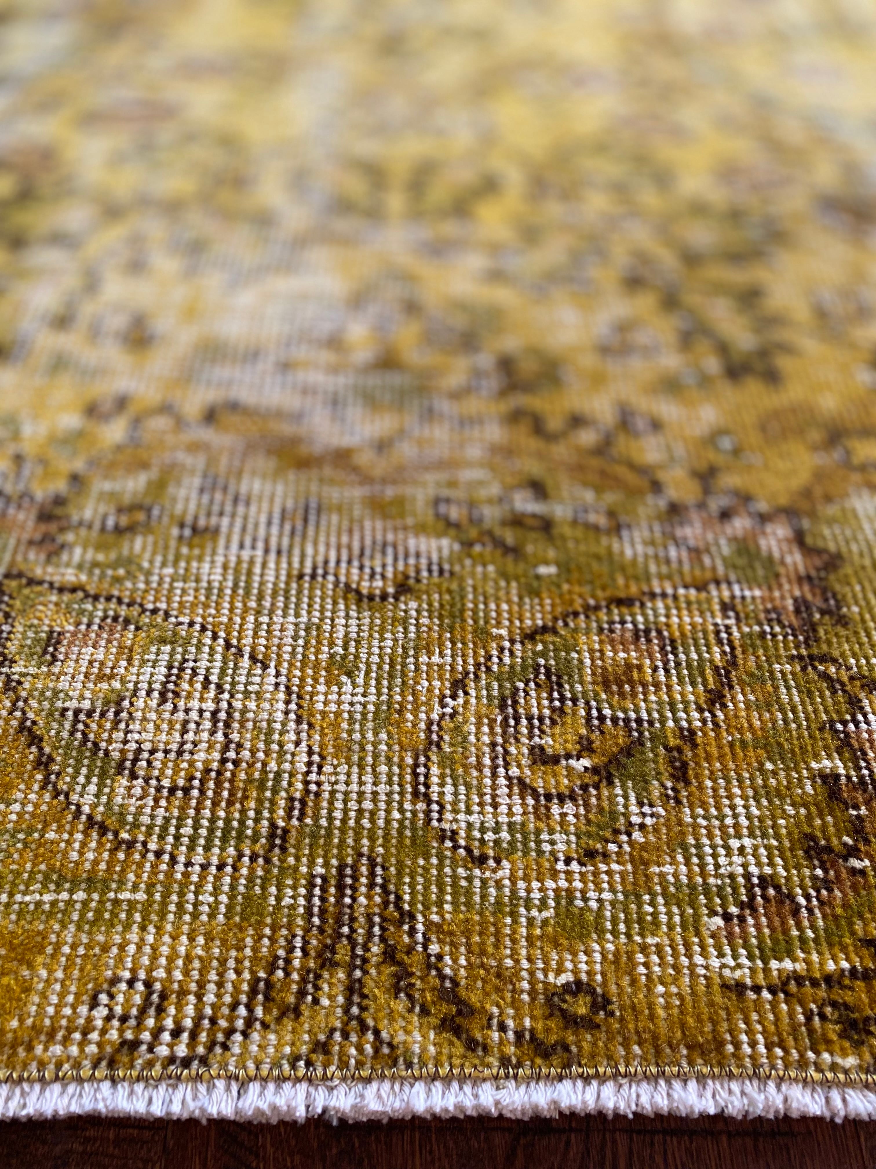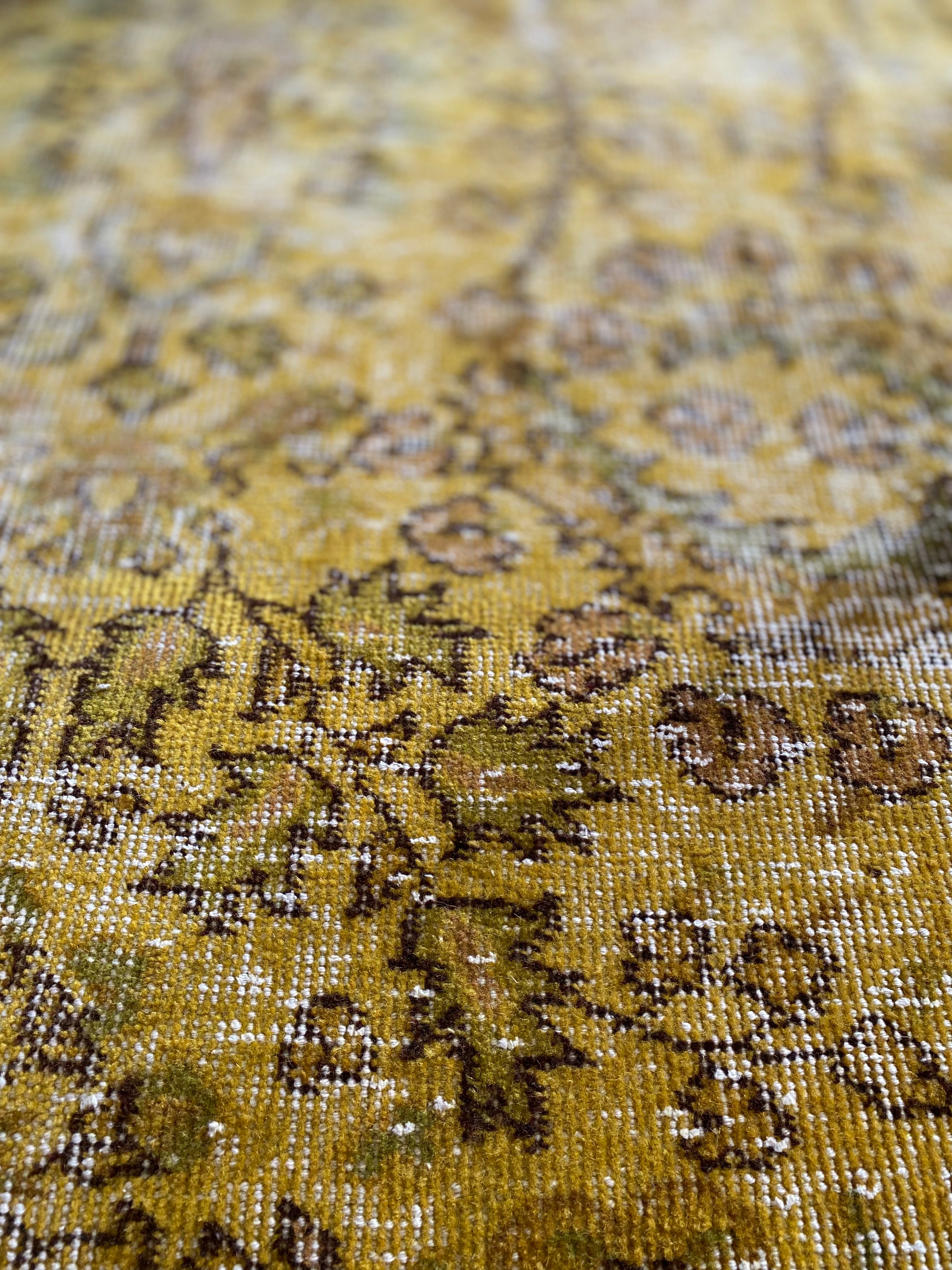 空間に鮮やかなアクセントを添える、イエローオーバーダイのヴィンテージラグ。