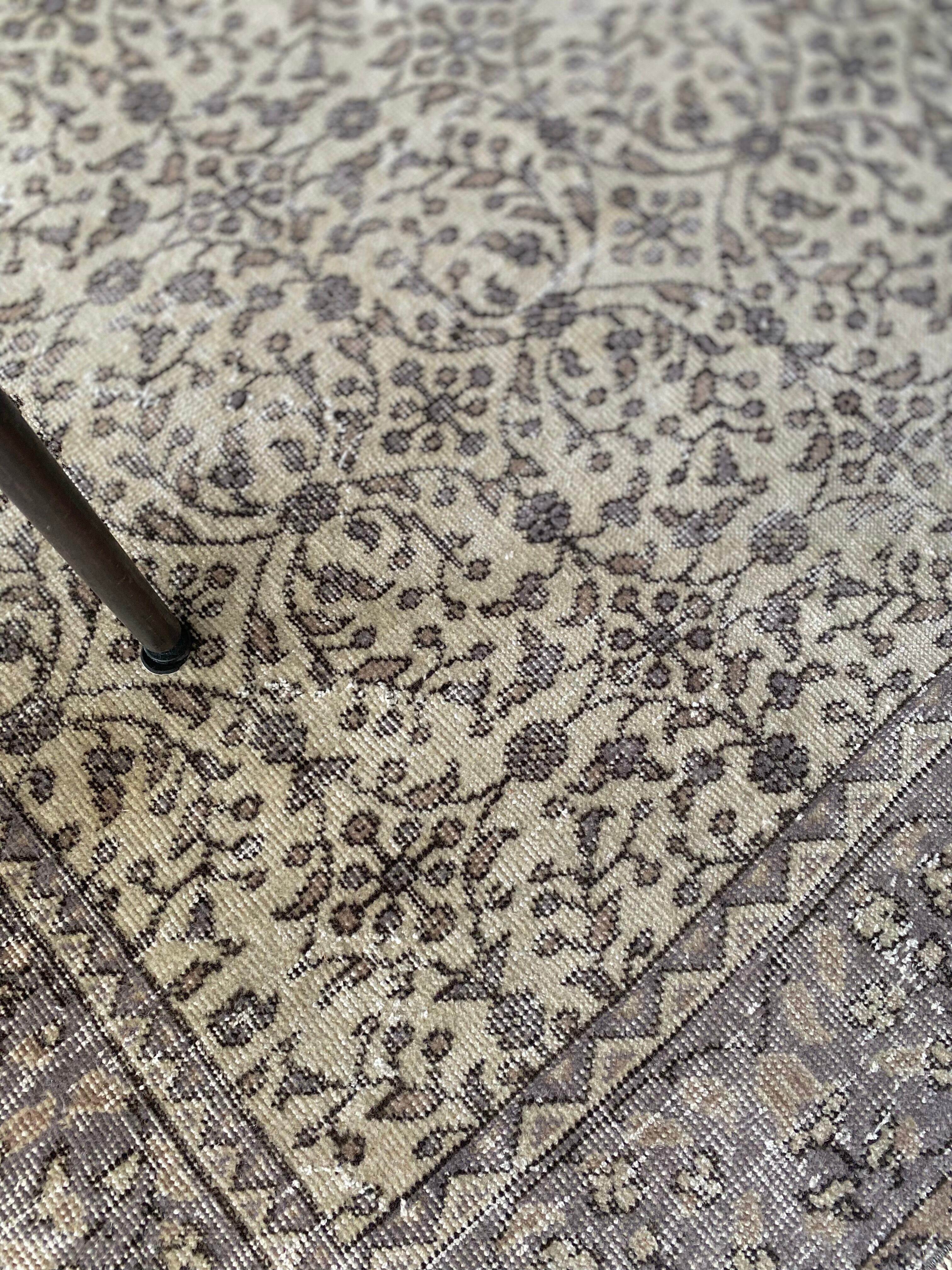 やわらかなベージュをベースに、グレーとベージュで繊細な草花模様をあしらったヴィンテージラグです。落ち着いた色調で、空間に自然と馴染みながらも、さりげない存在感を放ちます。