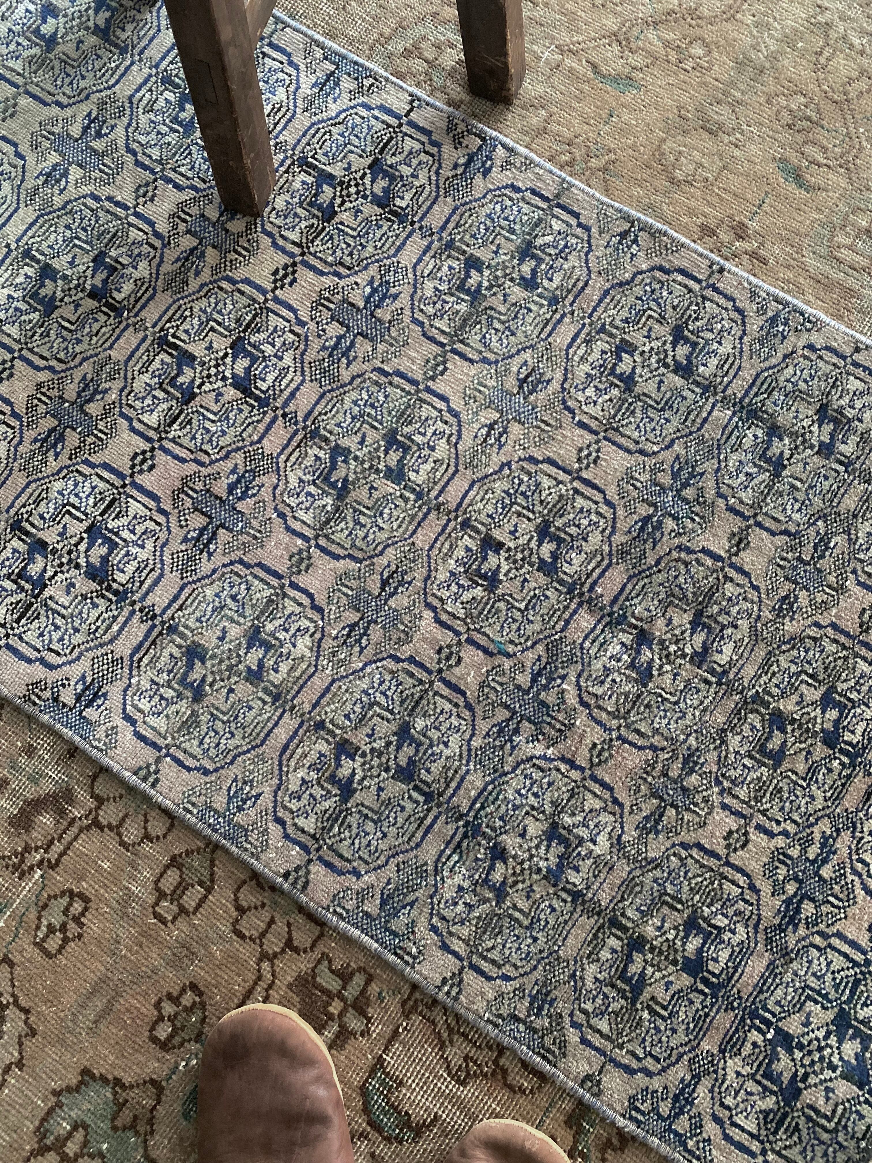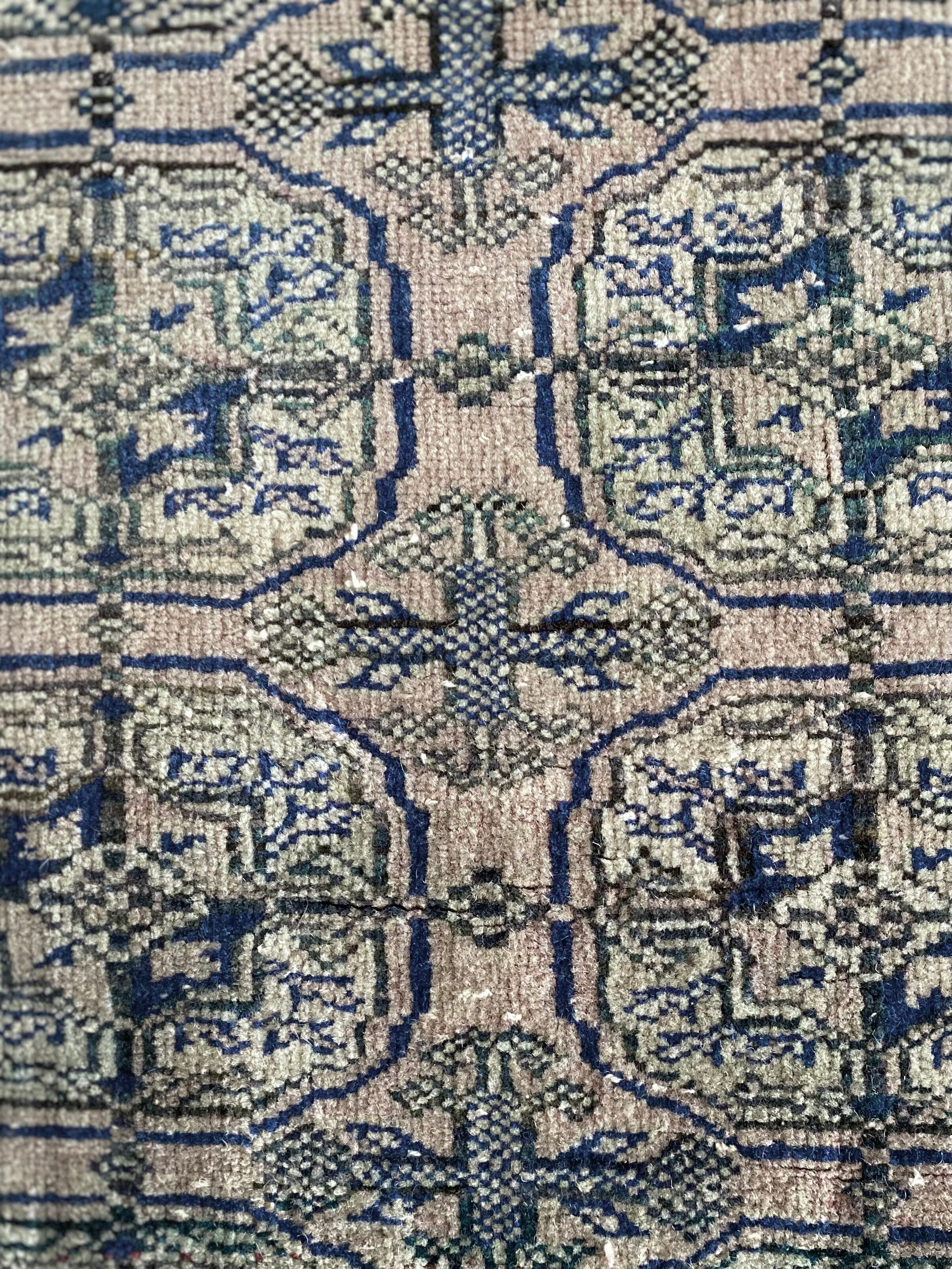 うっすらとしたピンクベージュをベースに、深みのあるネイビーで織り込まれたボハラ柄のヴィンテージスモールラグ。
