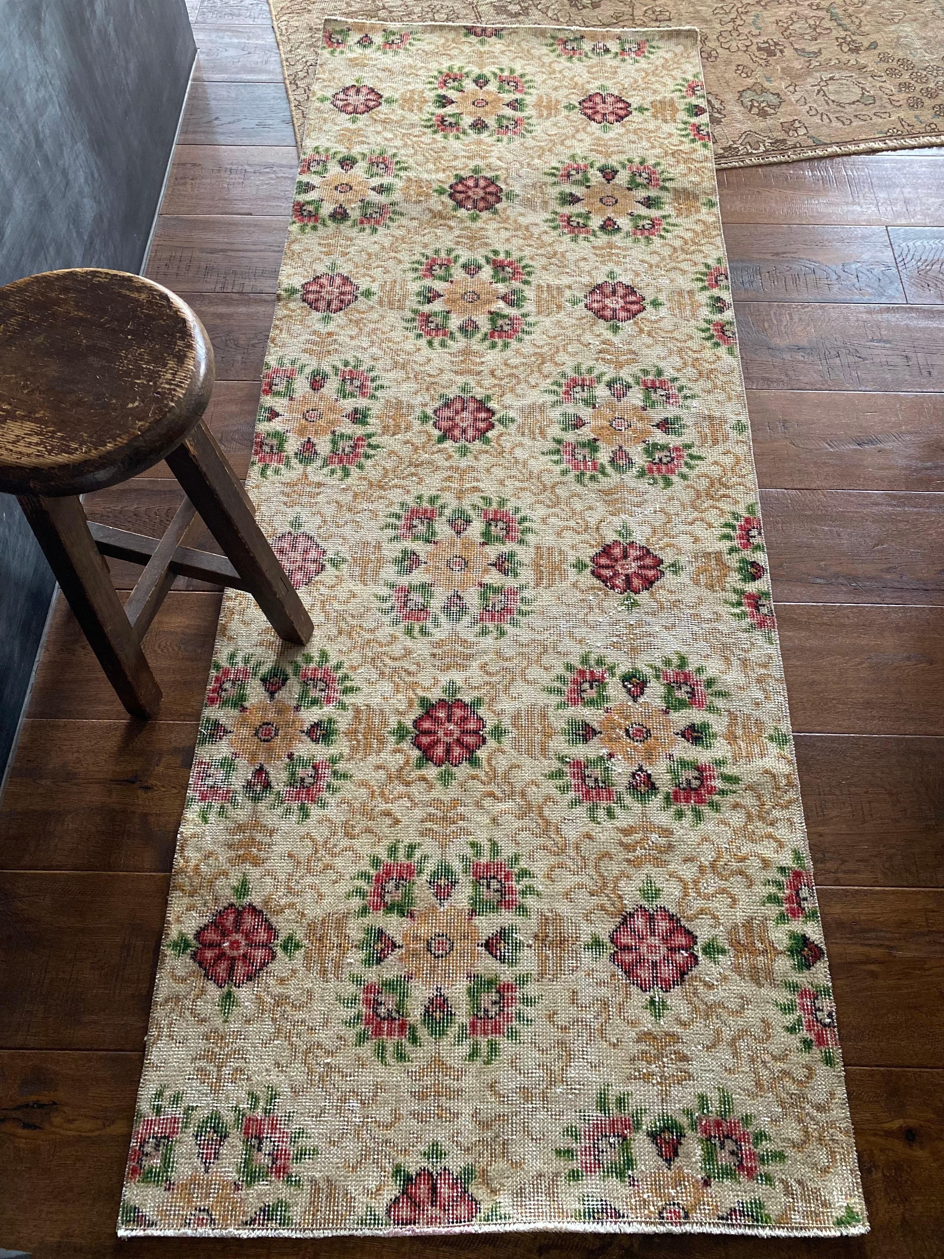 クラシカルなフラワーモチーフが並ぶヴィンテージランナーラグ。