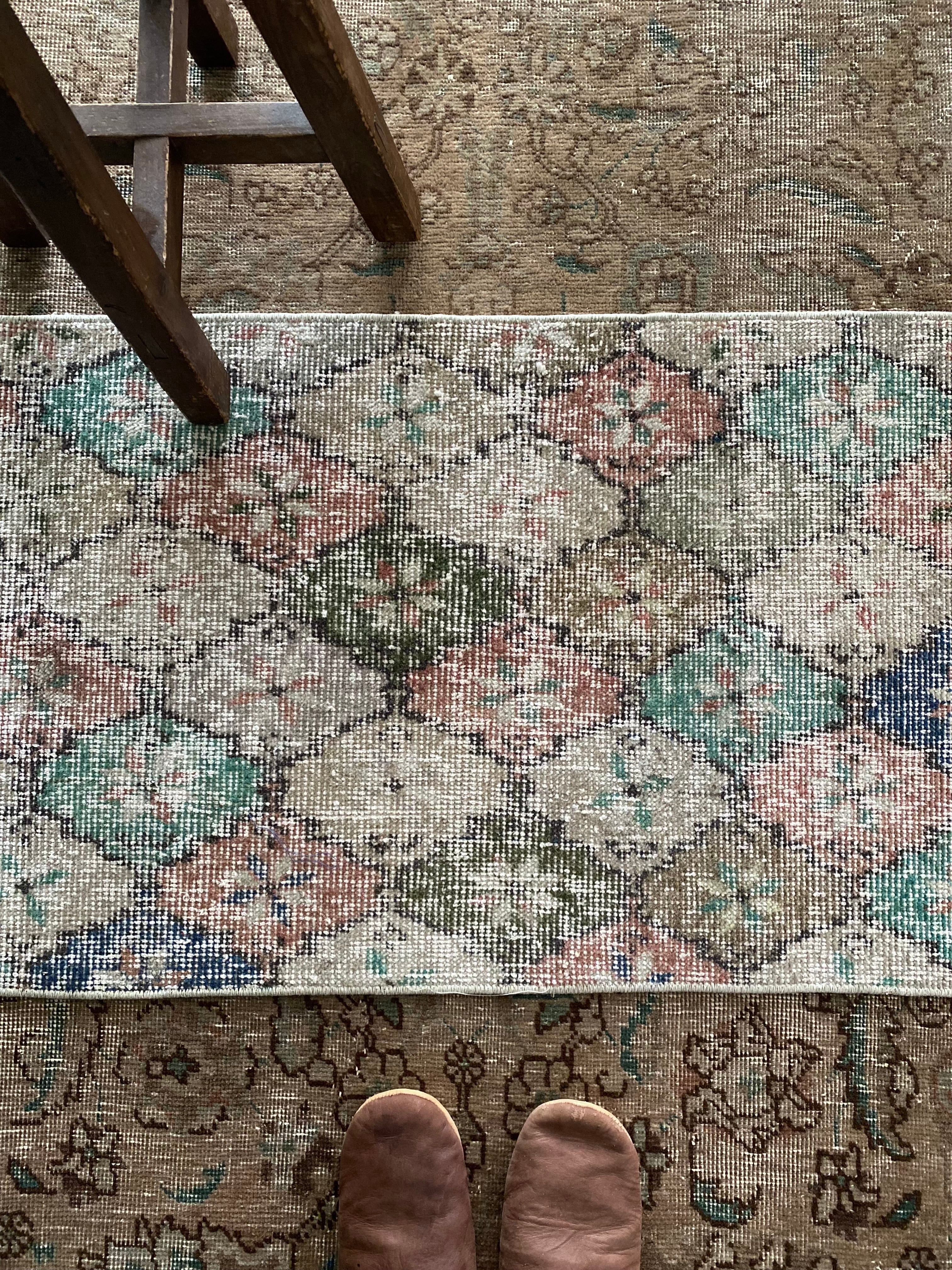 味わい深い色合いと、使い込まれた風合いが魅力のヴィンテージスモールラグ。