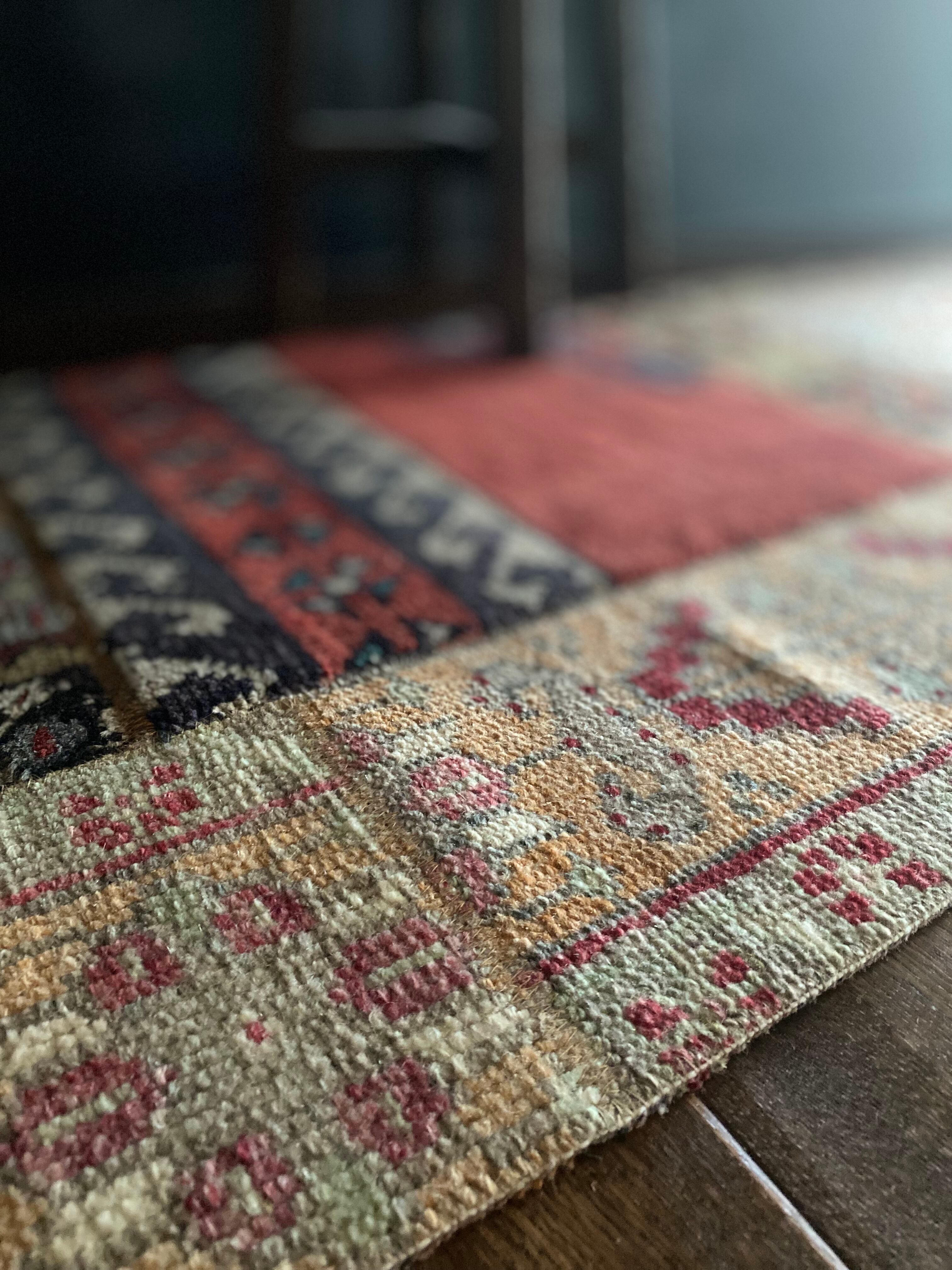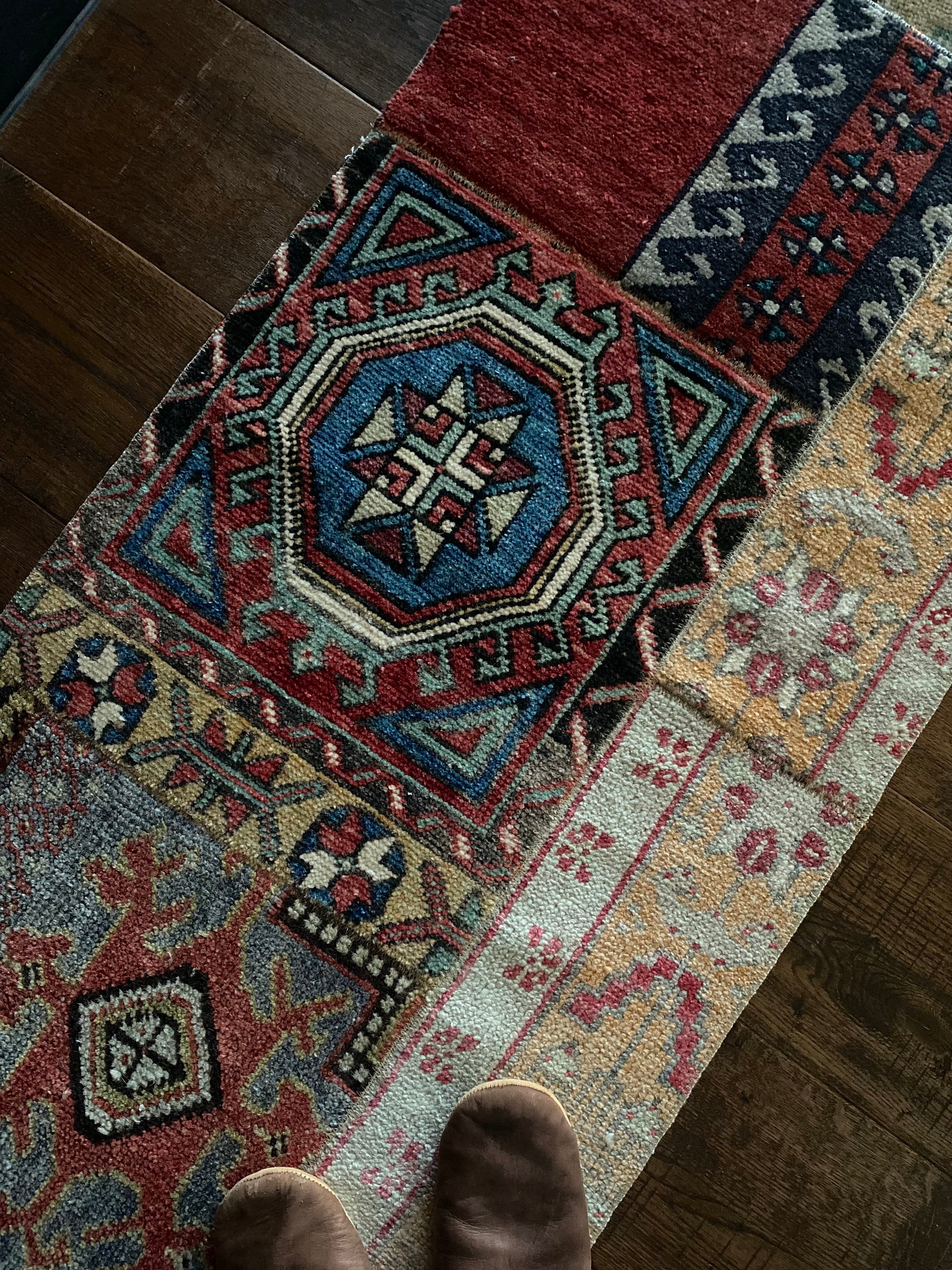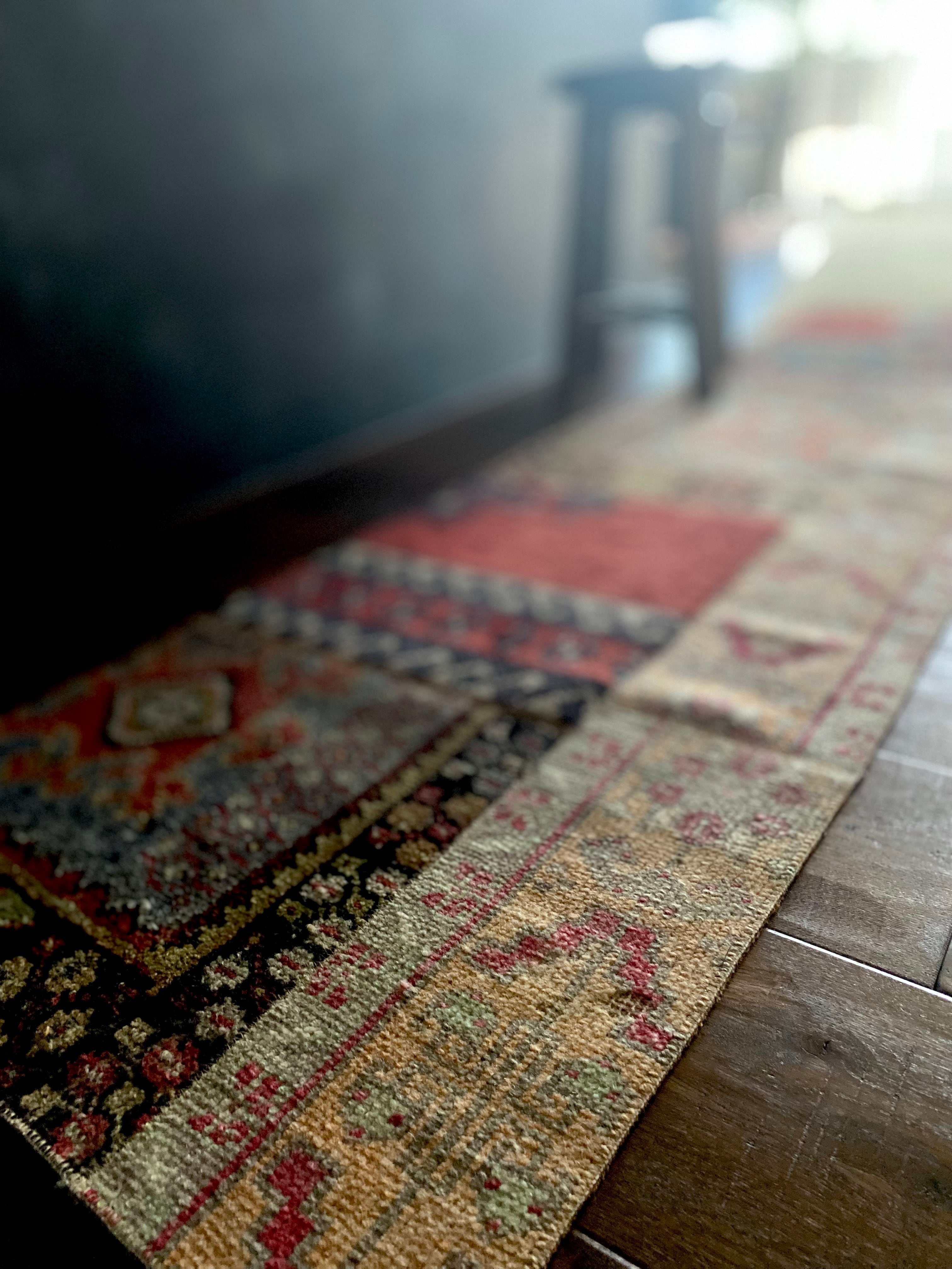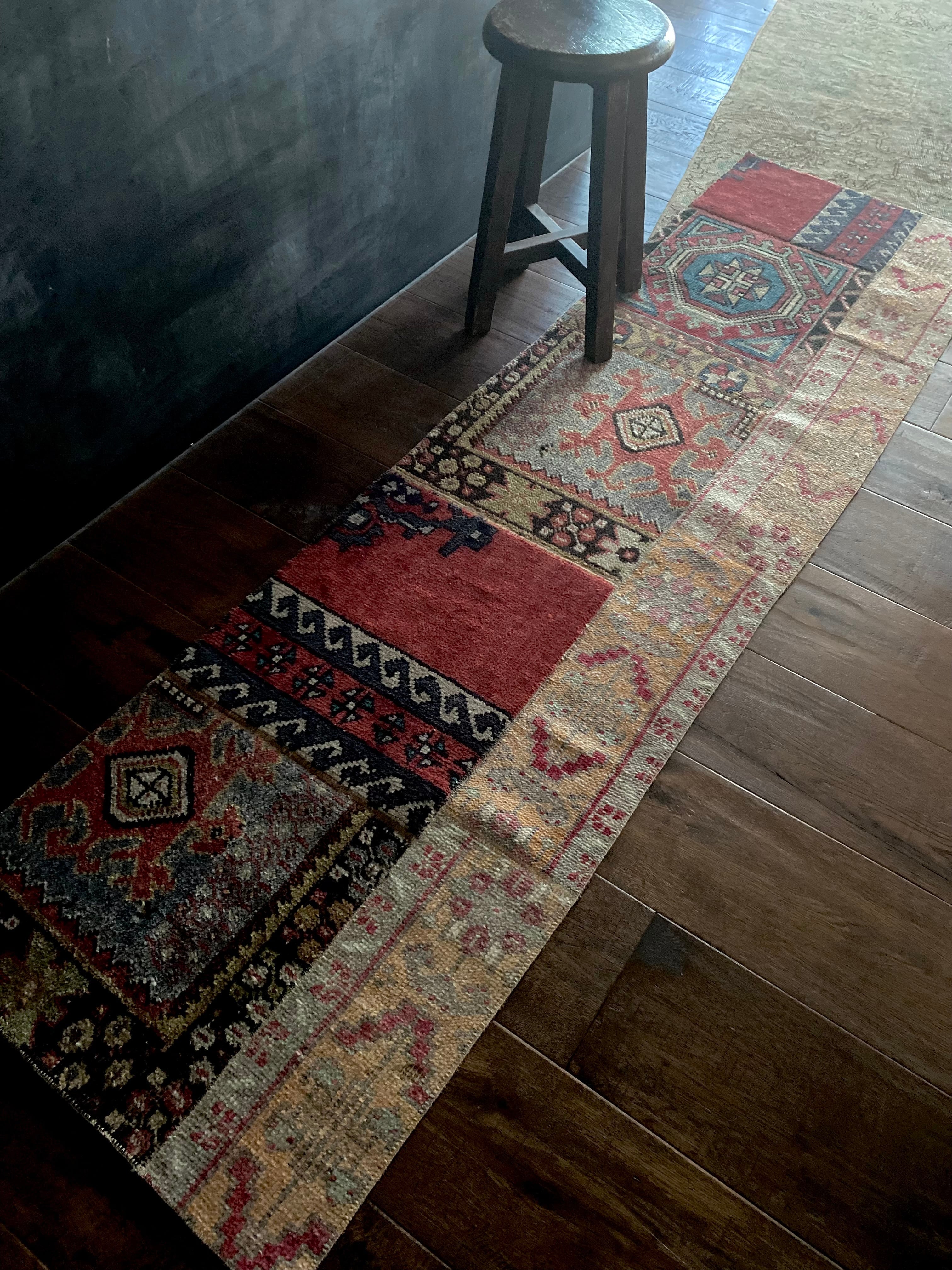 異なるラグを組み合わせて生まれた、パッチワークのランナーラグ。