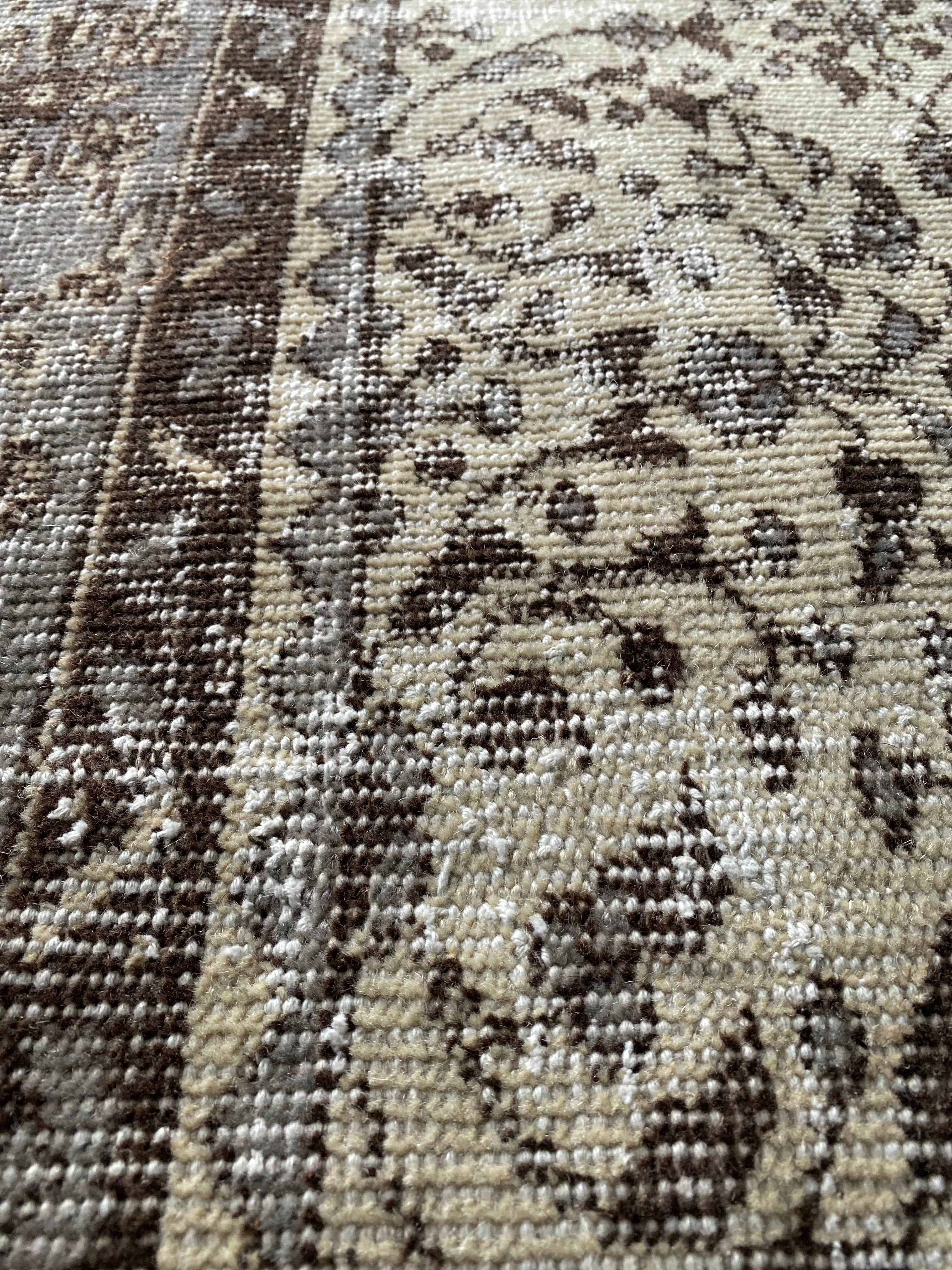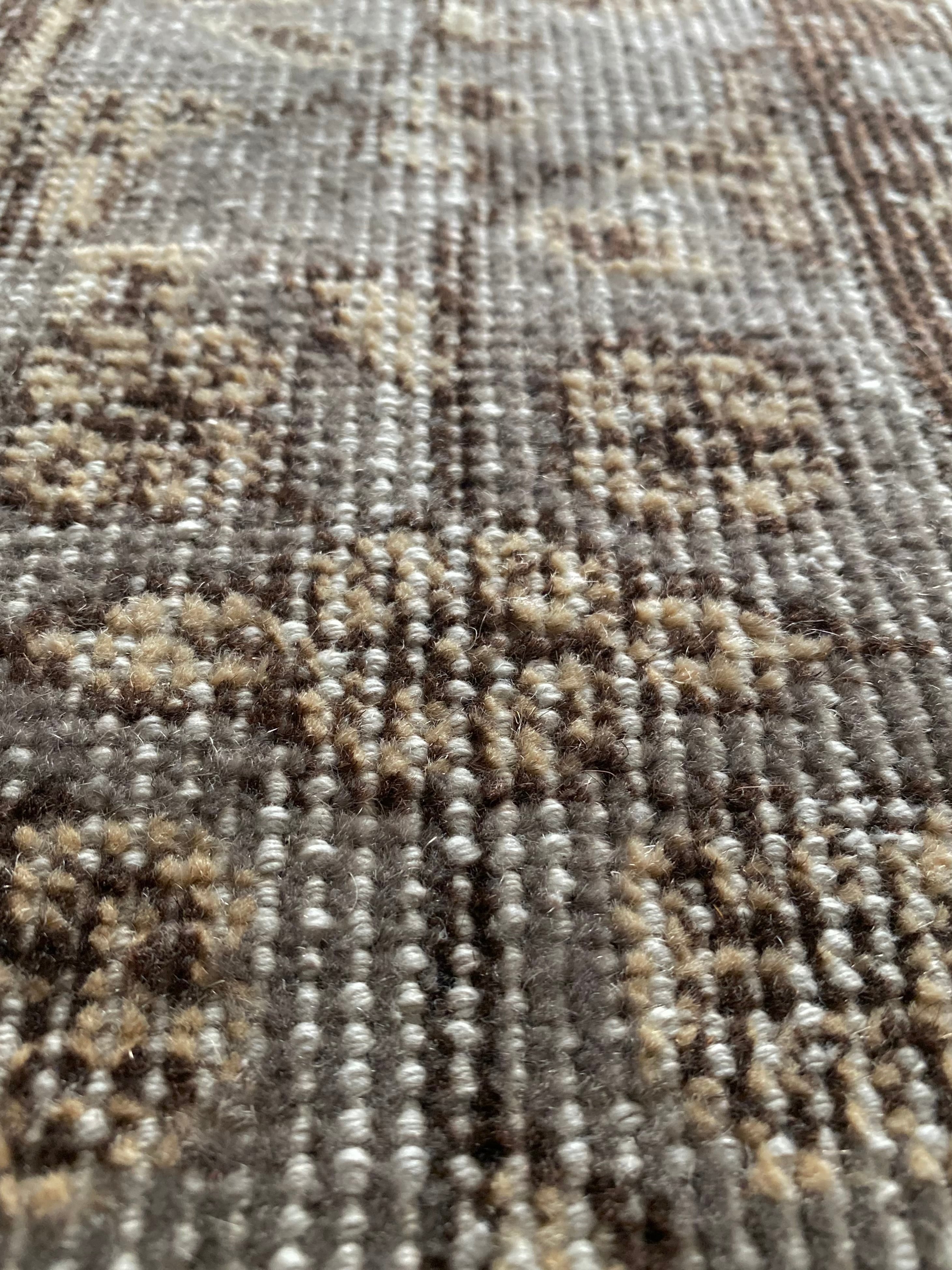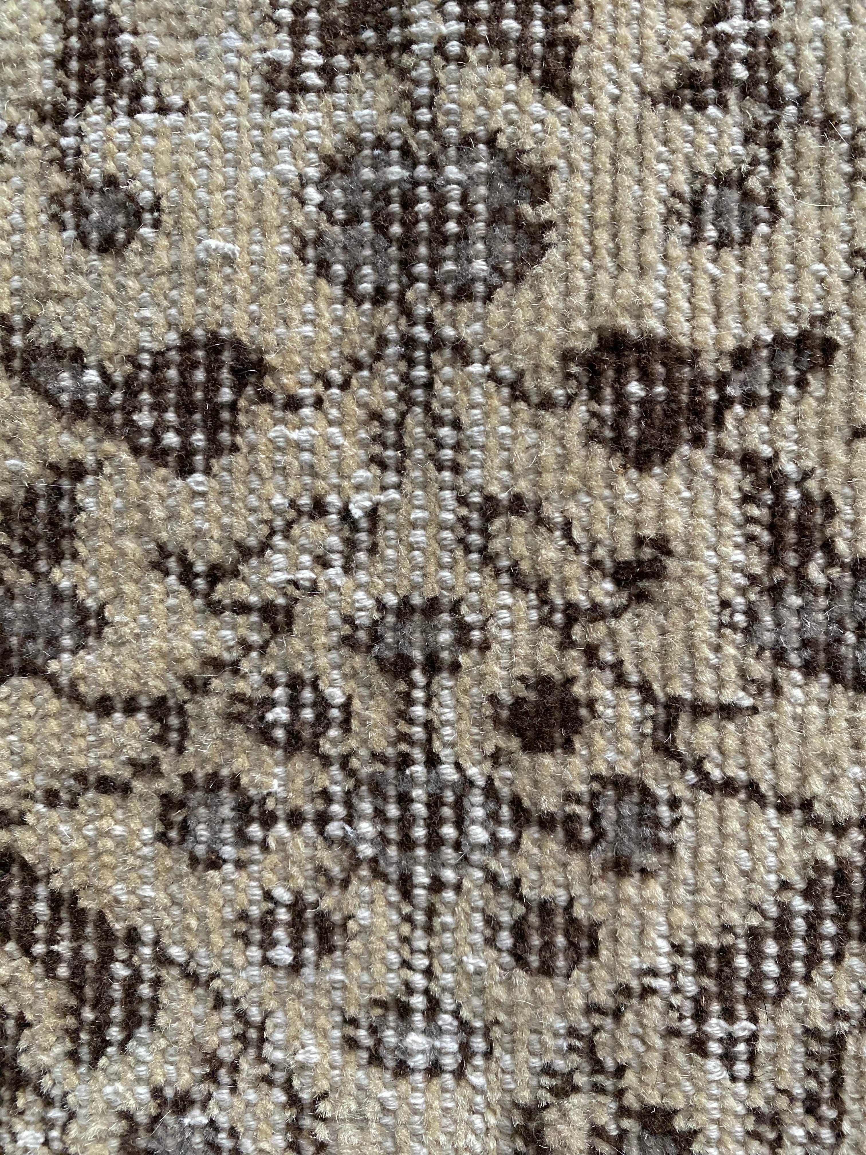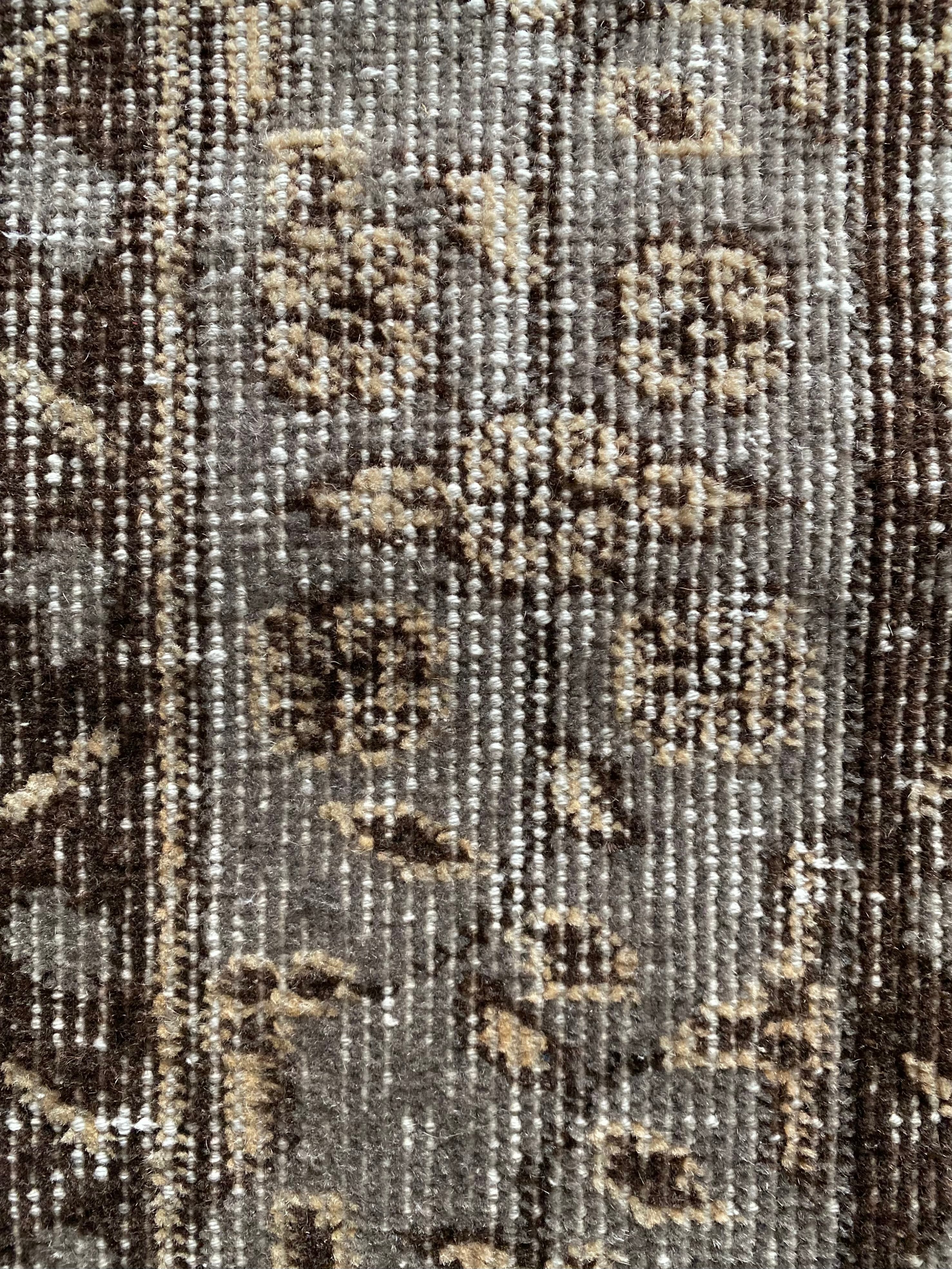 ベージュをベースに、ブラウンとグレーで表現された繊細な柄。経年によるかすれた風合いが美しく、主張しすぎず、それでいてしっかりと存在感を放ちます。