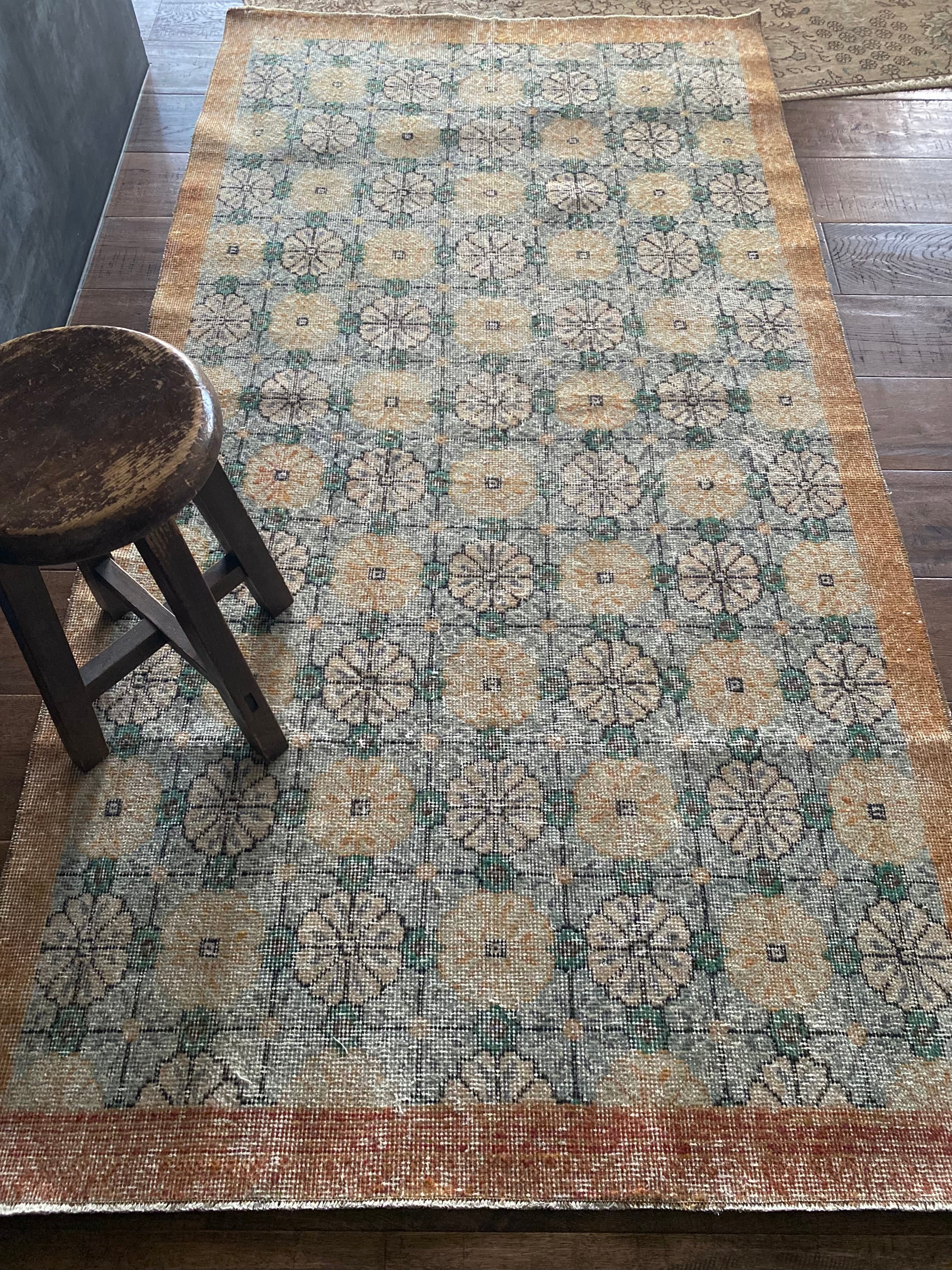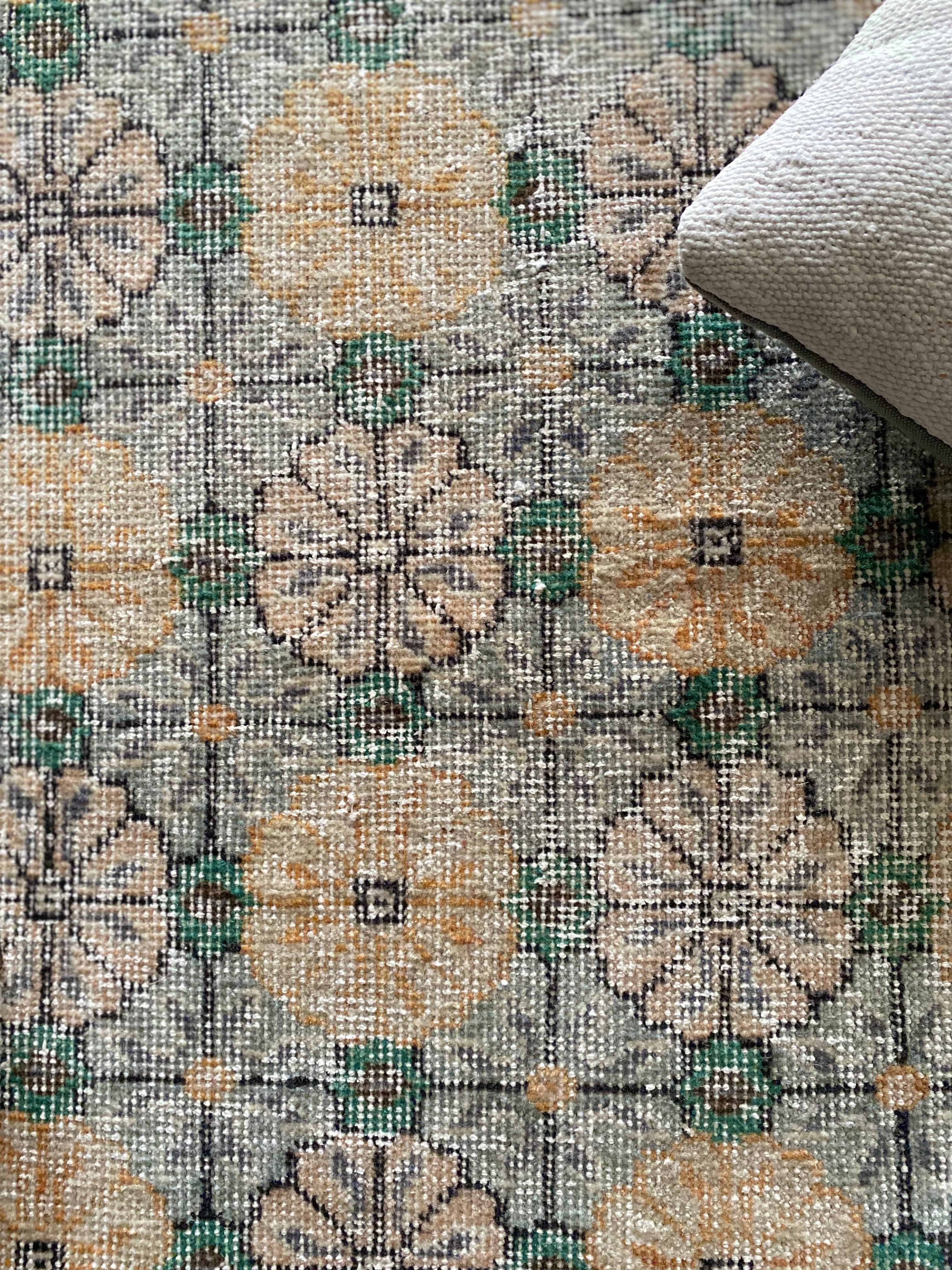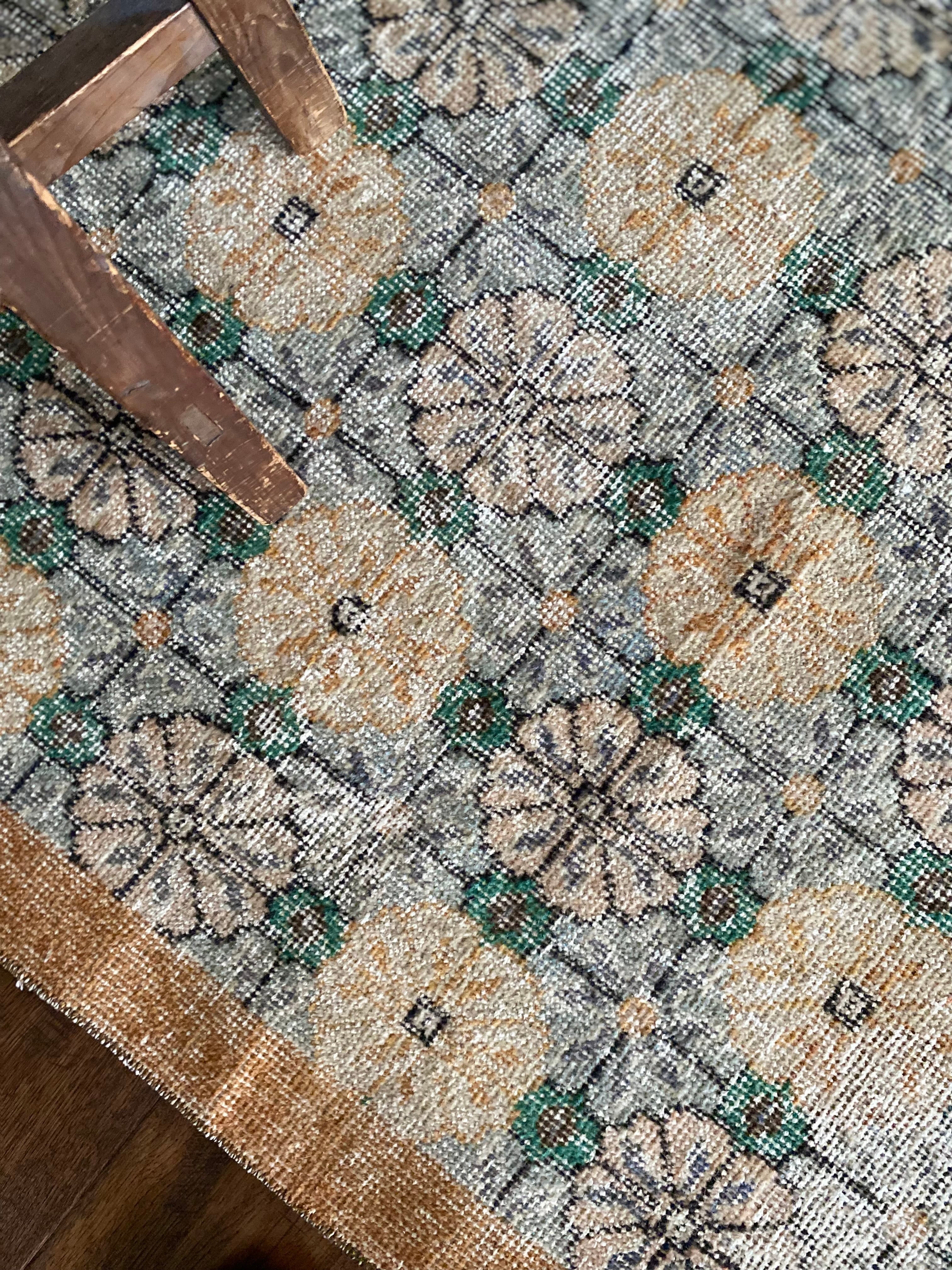 お花畑をそのまま閉じ込めたような、やさしい花柄のヴィンテージラグ。