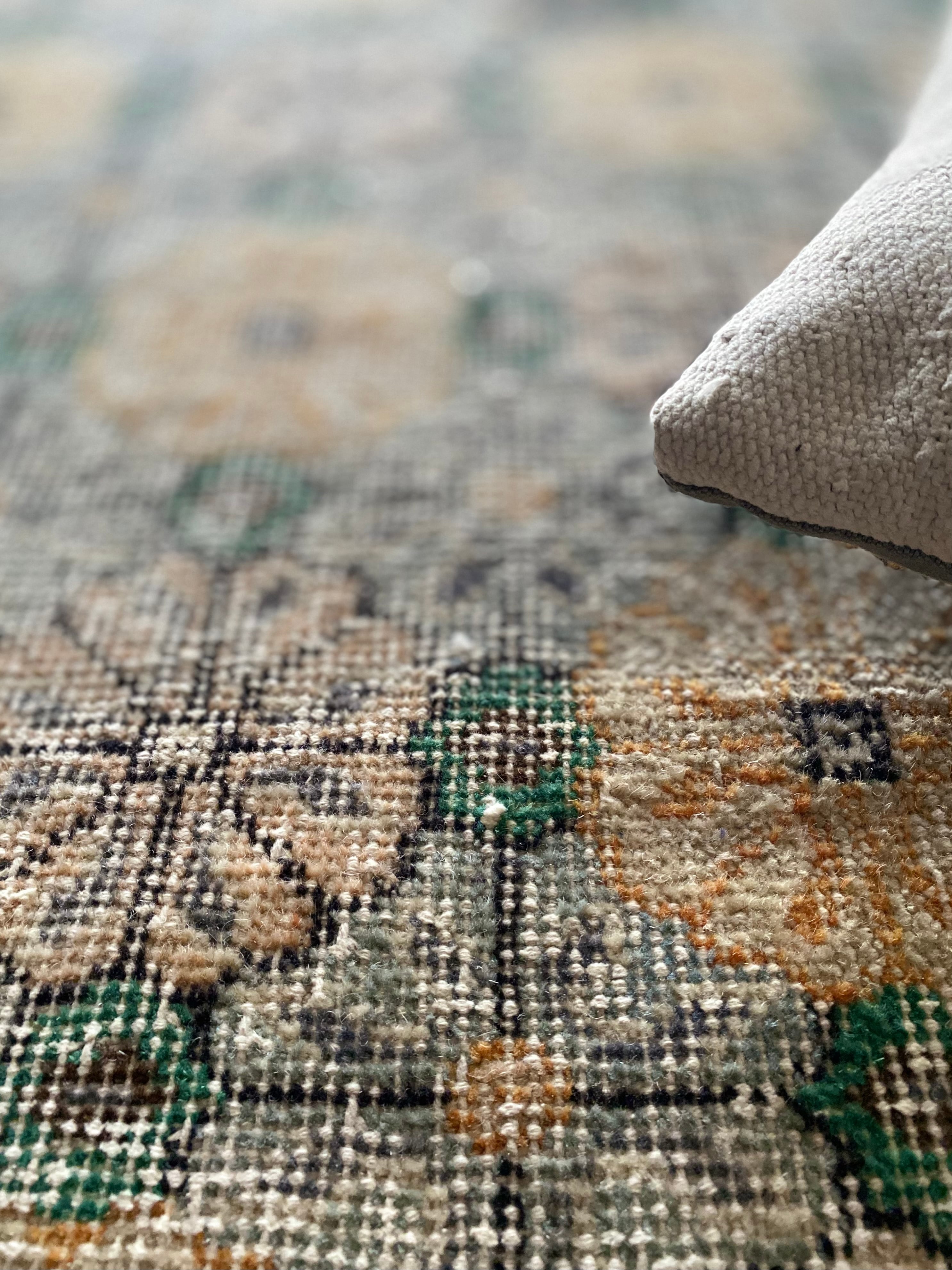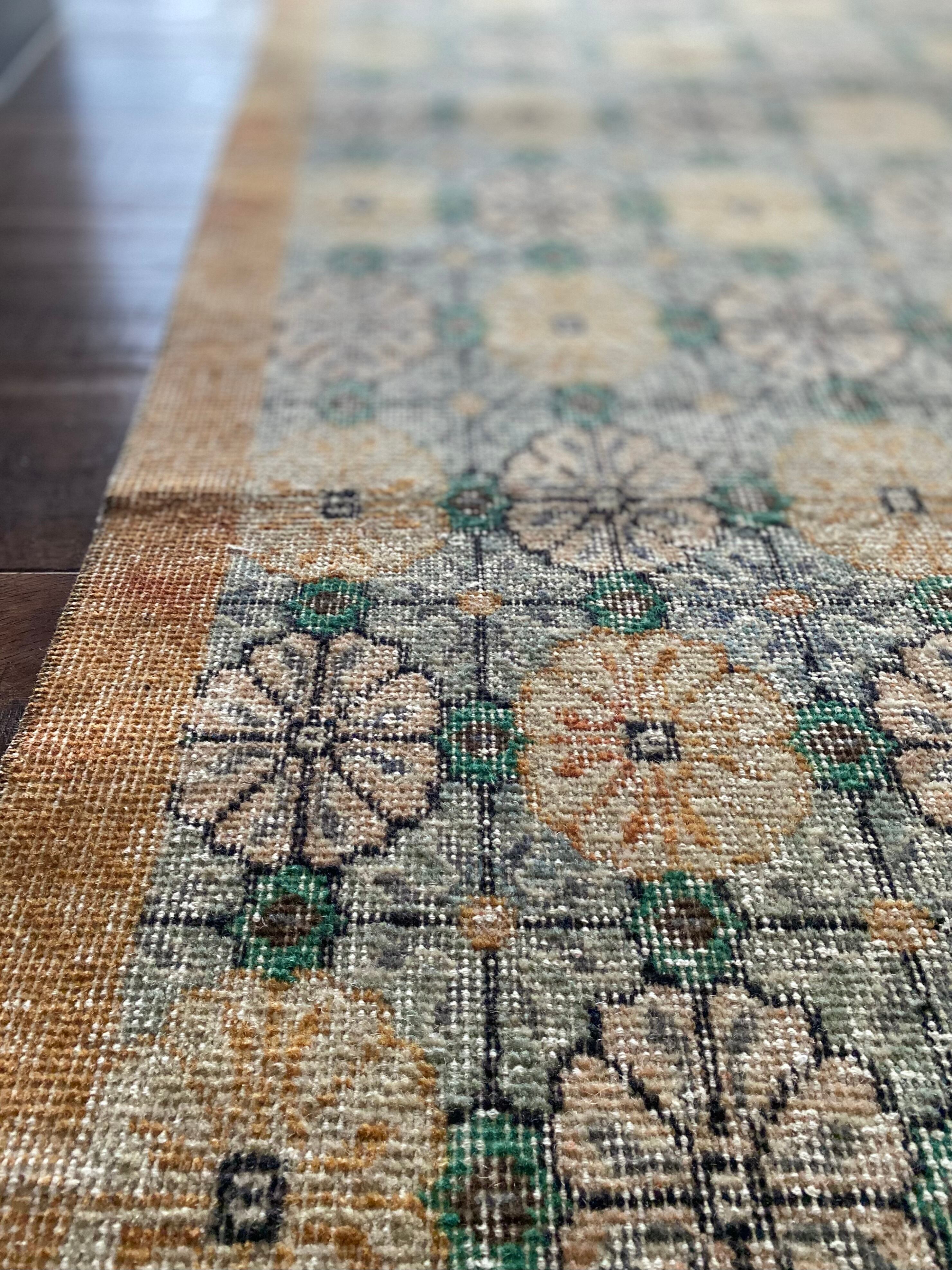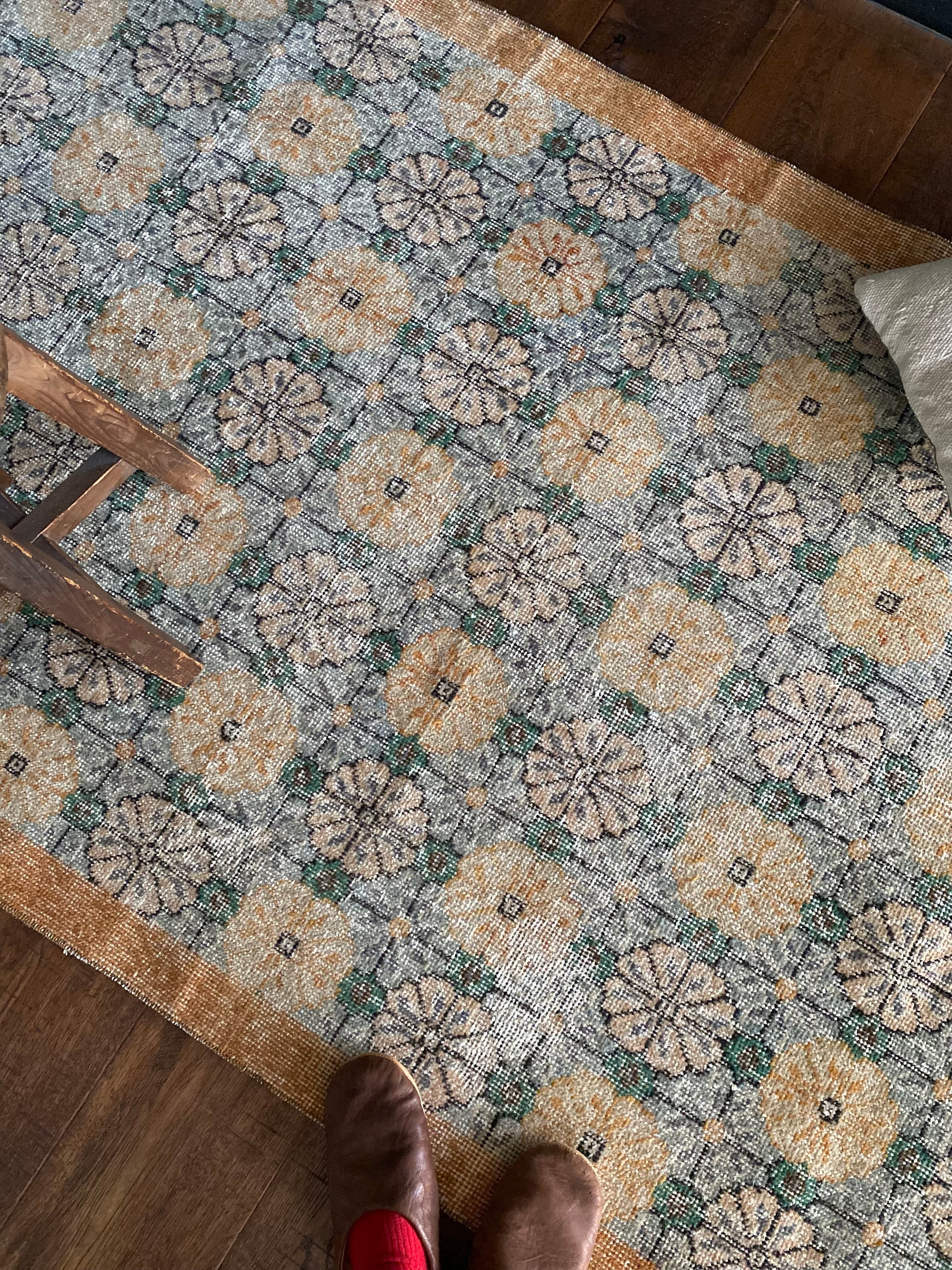 お花畑をそのまま閉じ込めたような、やさしい花柄のヴィンテージラグ。