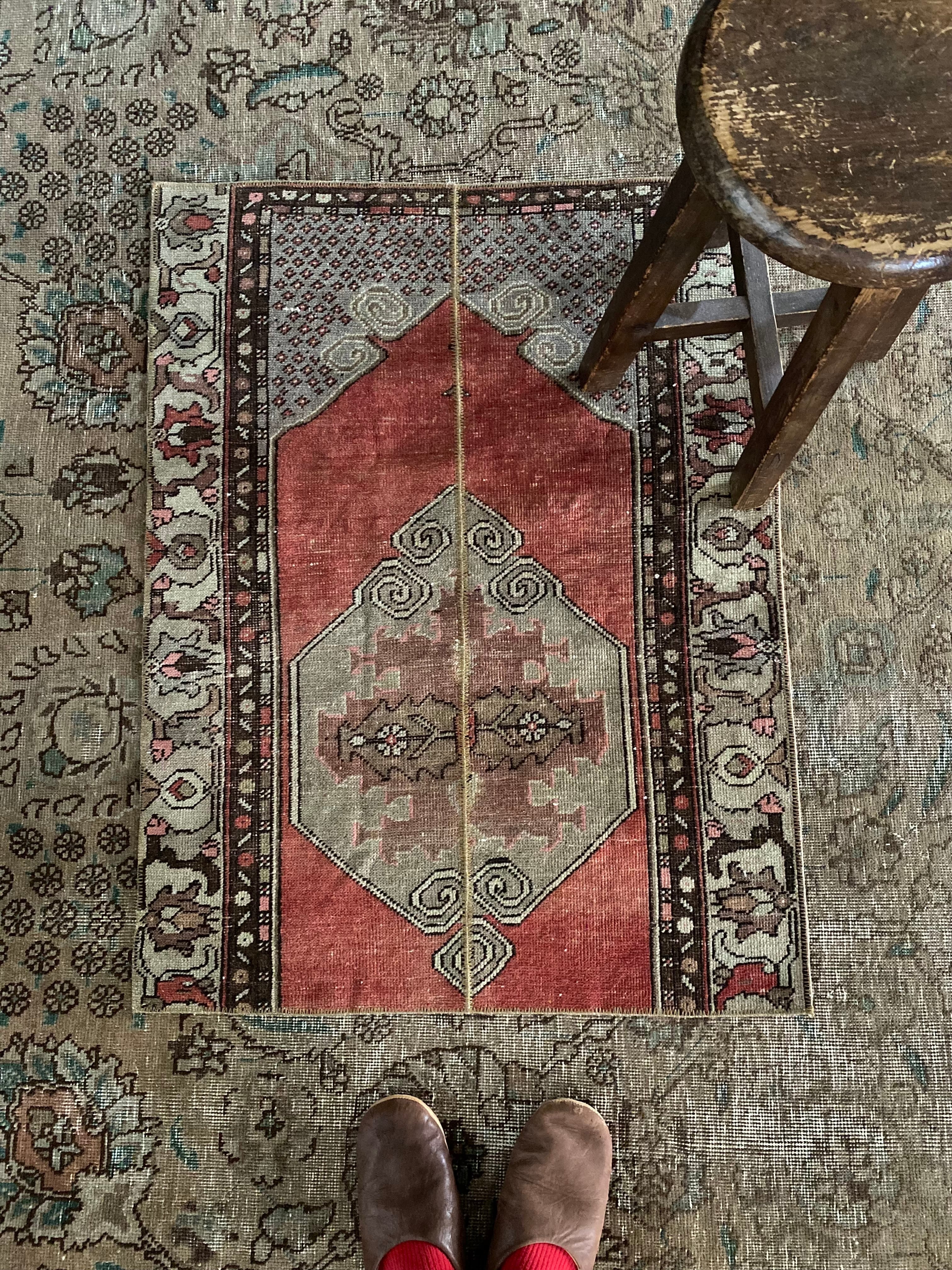 味のあるヴィンテージラグを、中央でつなぎ合わせた一点もののパッチワークデザイン。
