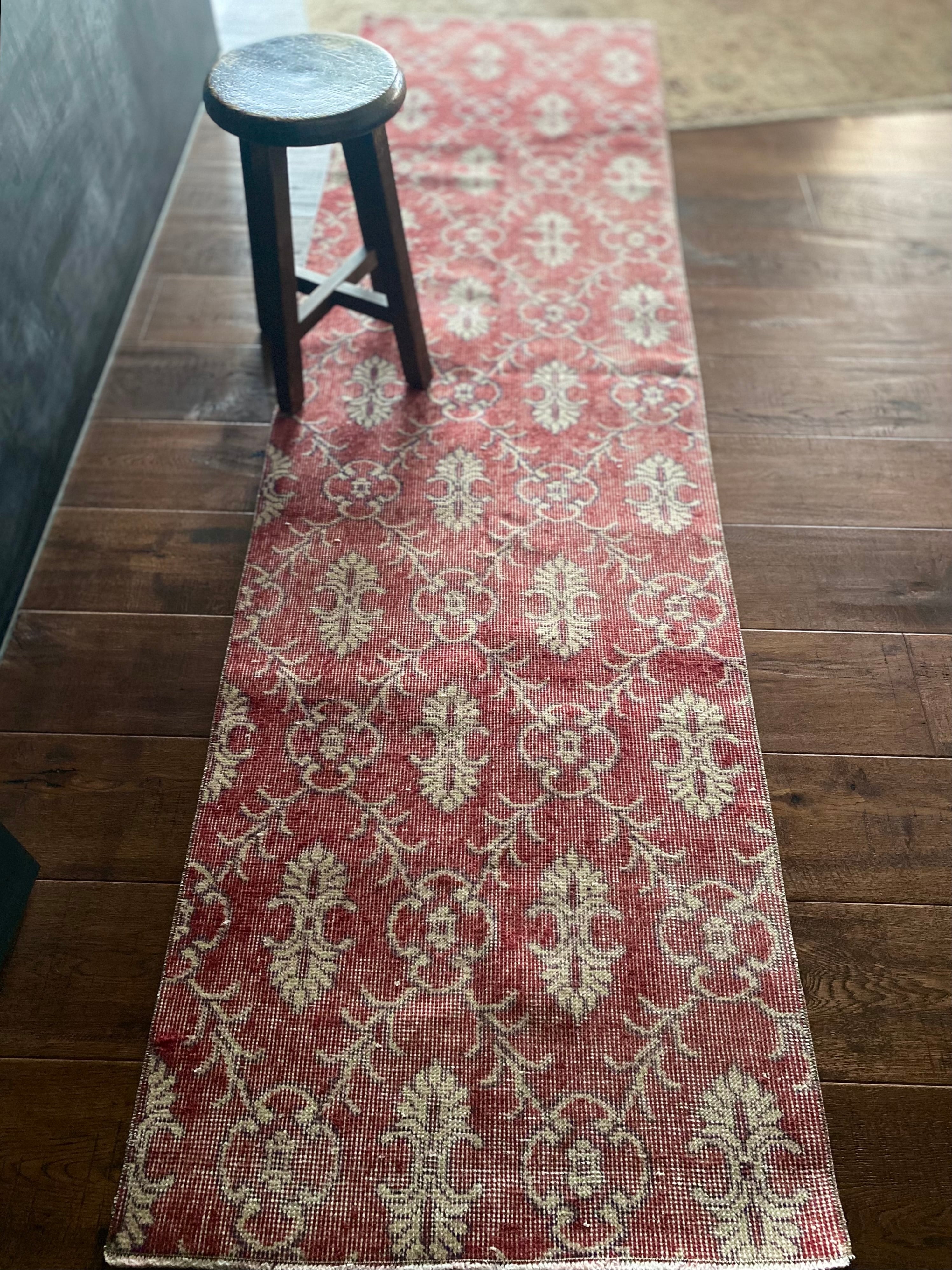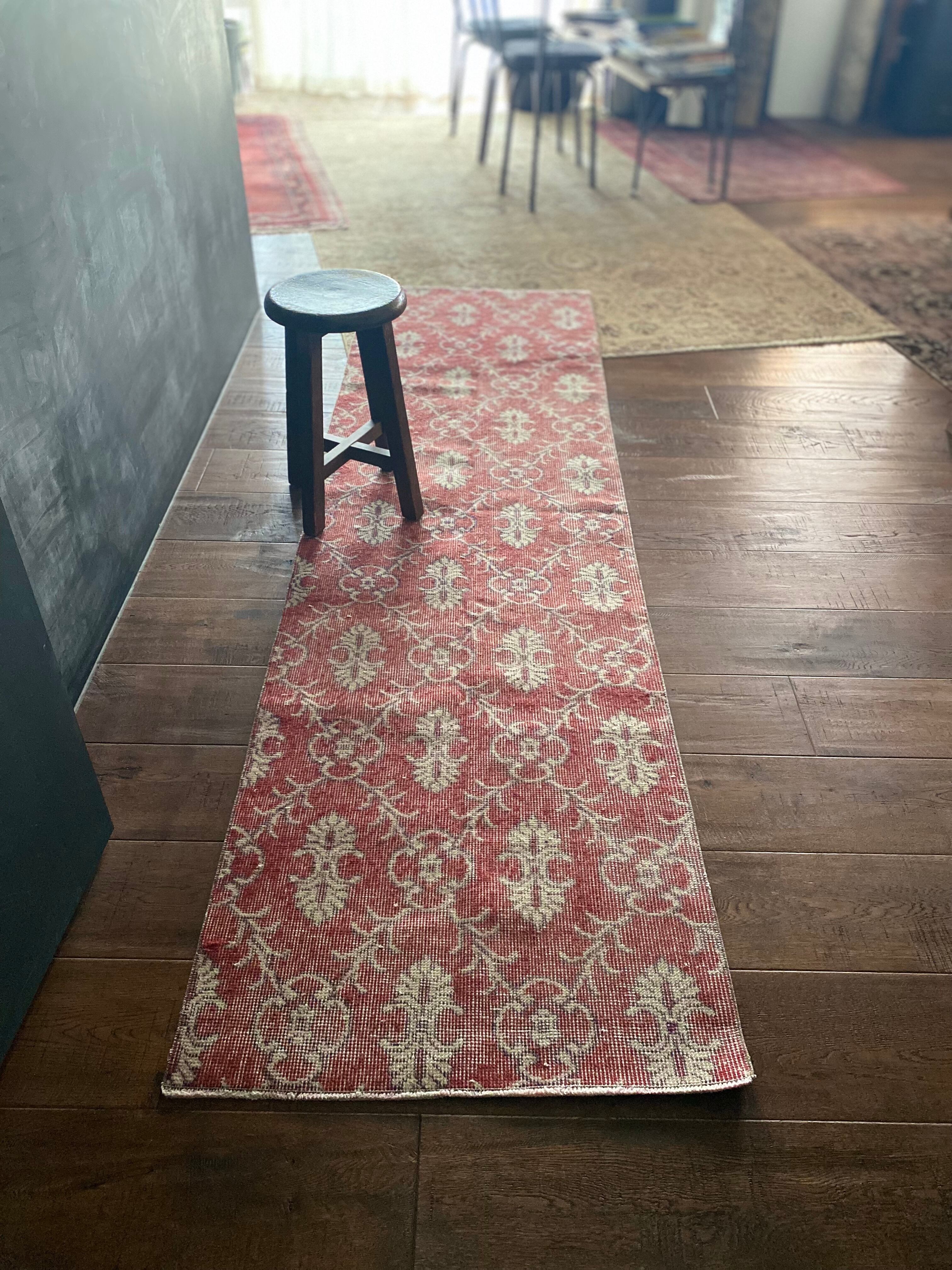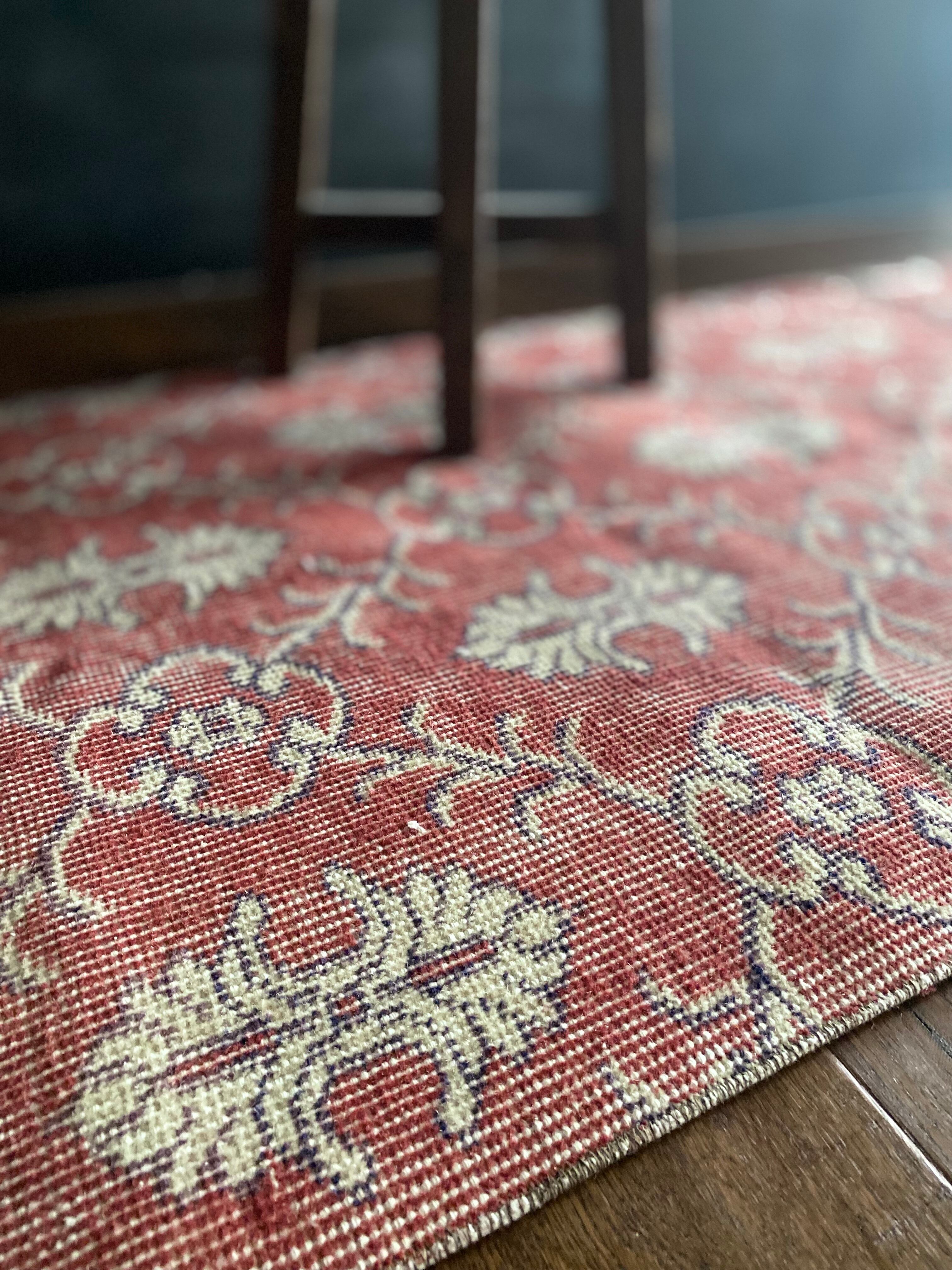 落ち着いた色褪せレッドに、アイボリーの紋章柄が美しく浮かび上がるヴィンテージランナーラグ。