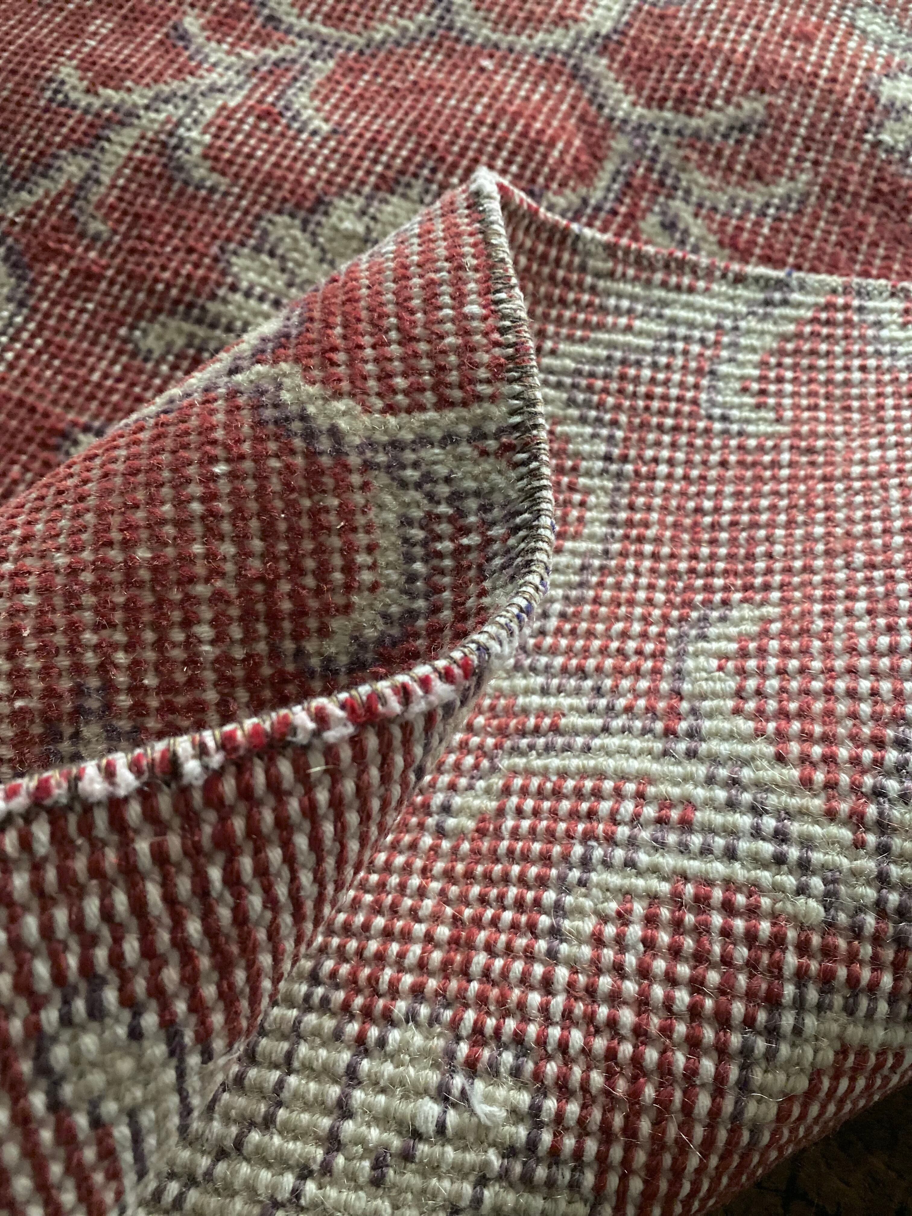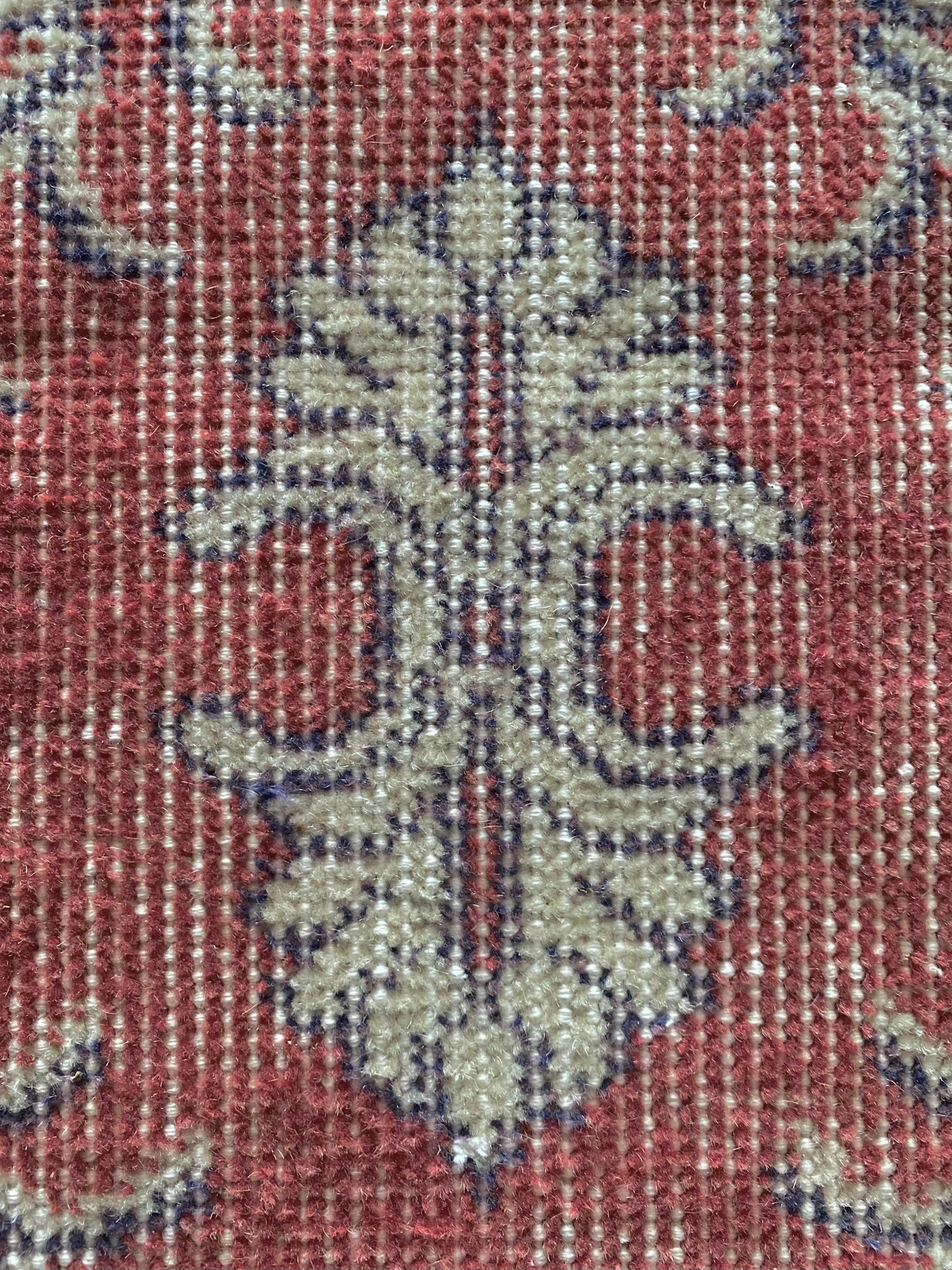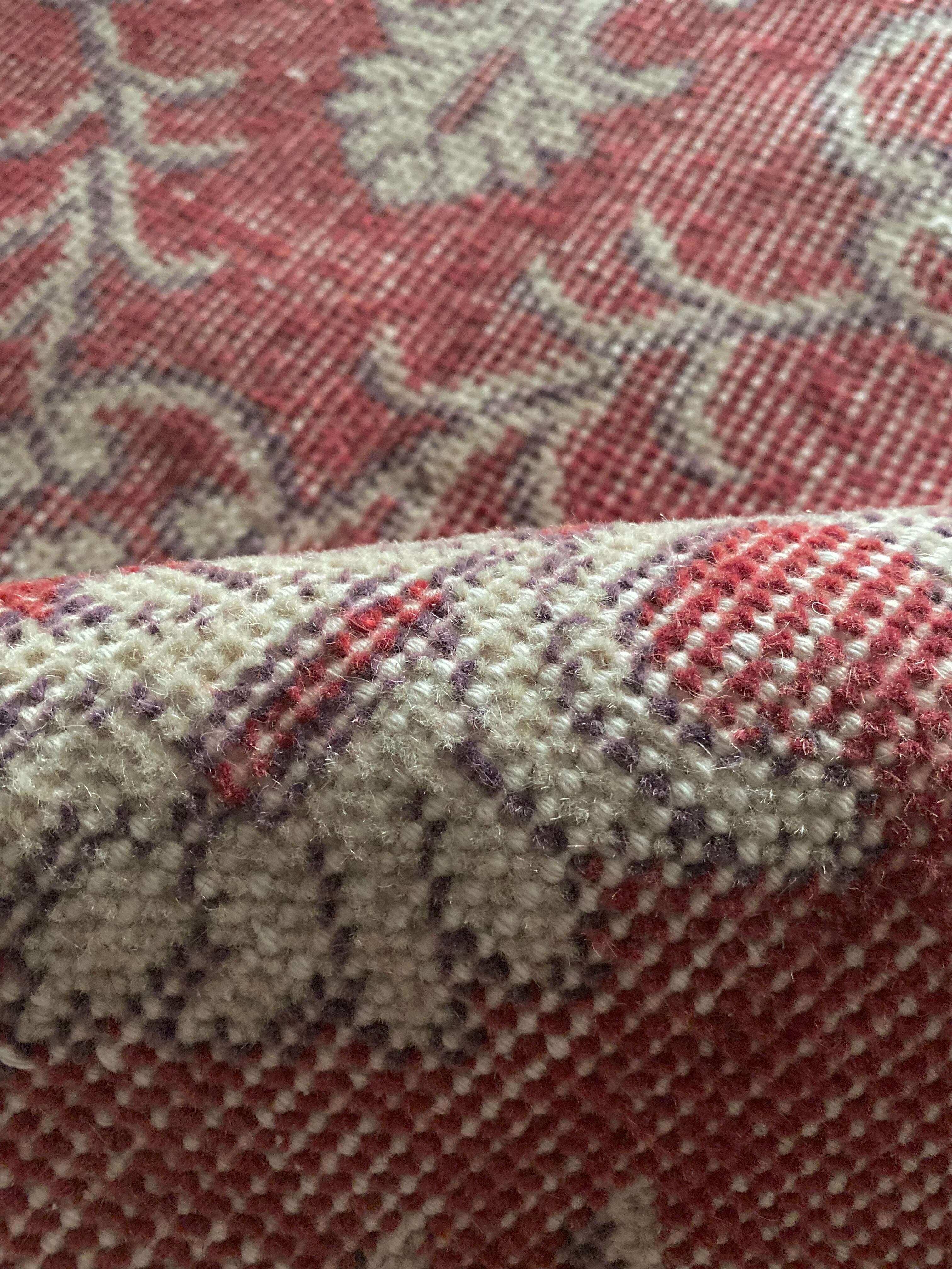 落ち着いた色褪せレッドに、アイボリーの紋章柄が美しく浮かび上がるヴィンテージランナーラグ。