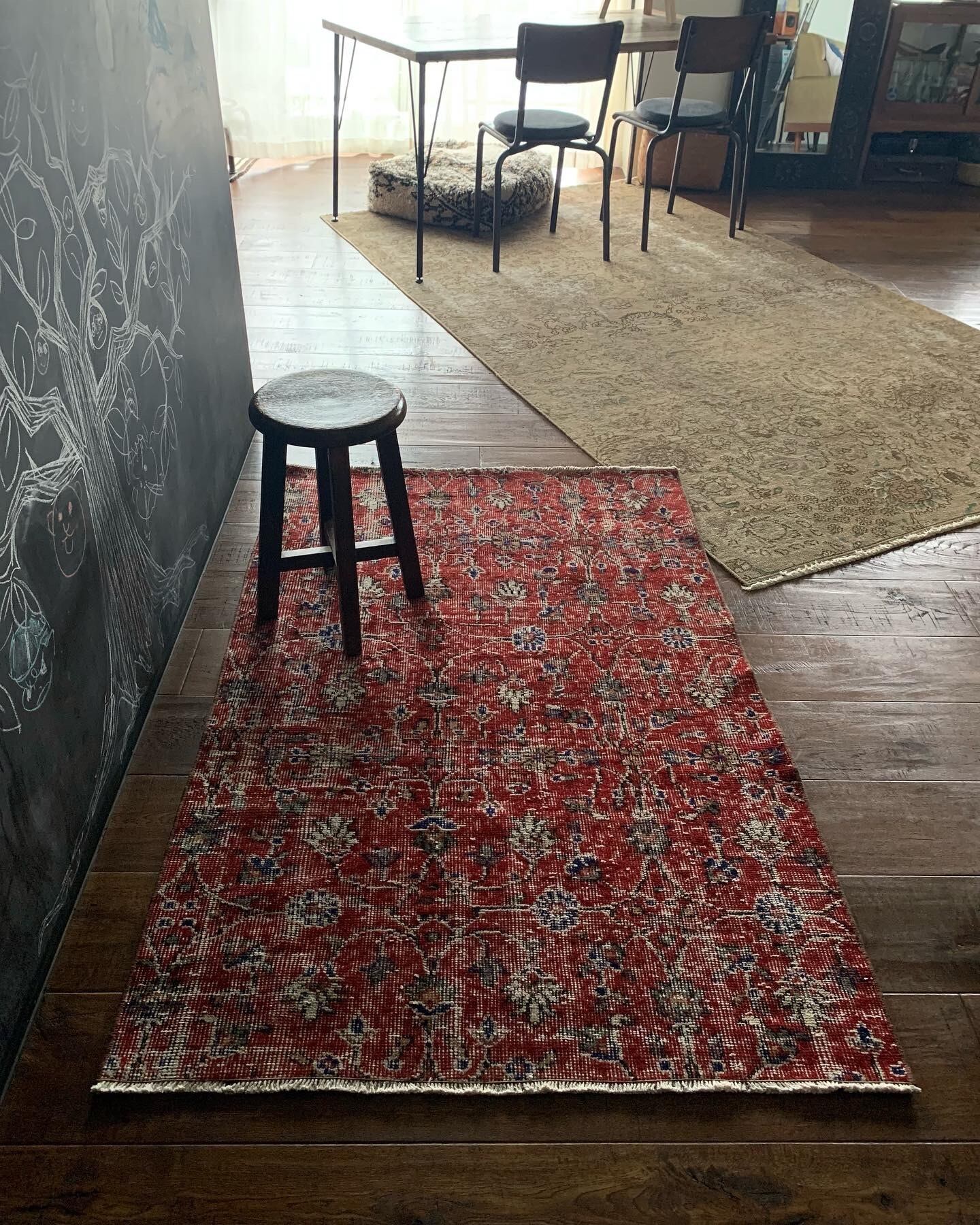✔︎手織りのヴィンテージラグの為、撓み、カスレ,糸の飛び出し修復などありますがどれもヴィンテージならではの風合いです。どのラグにも見られますので
